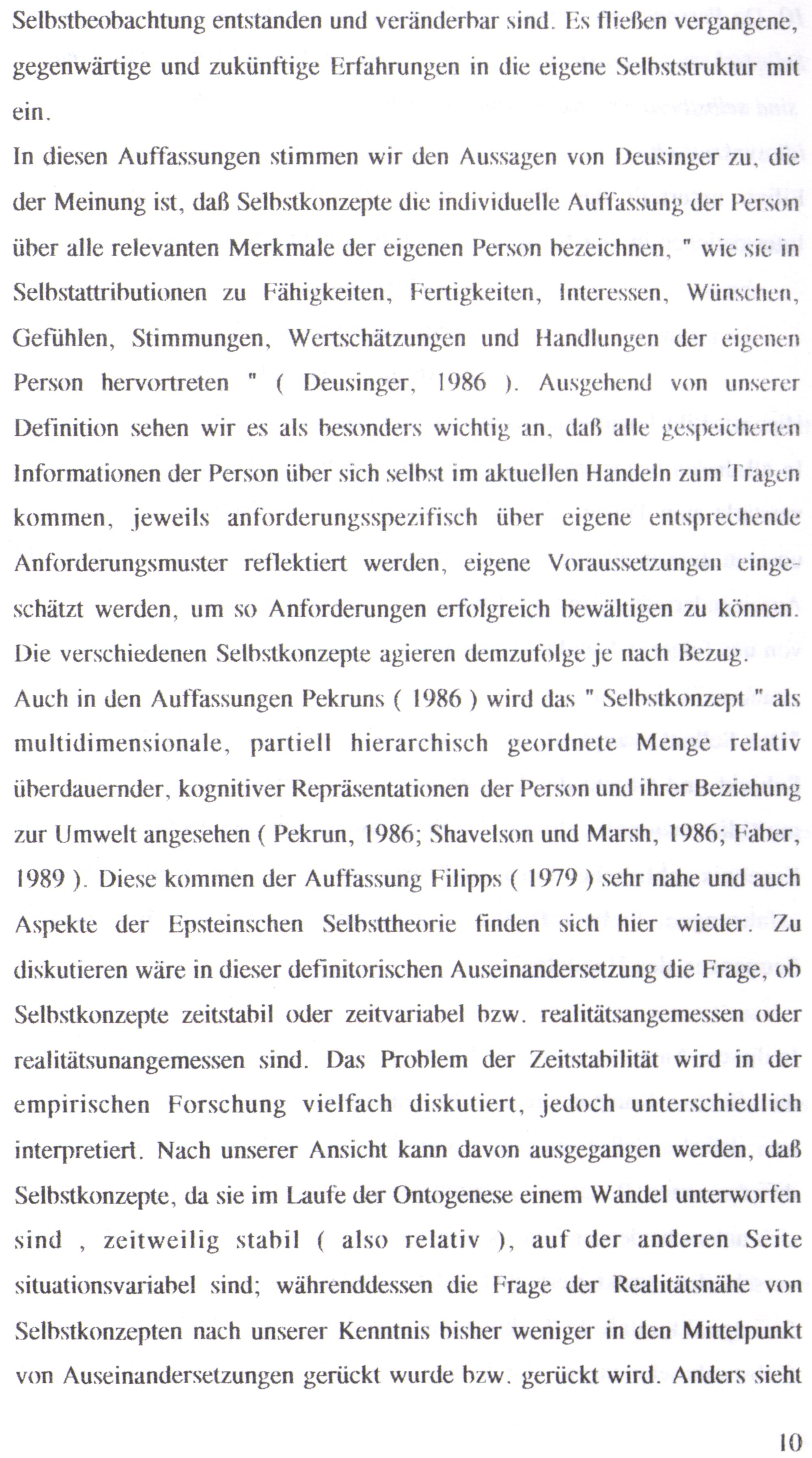 In diesen Auffassungen stimmen wir den Aussagen von Deusinger zu, die der Meinung ist, daß Selbstkonzepte die individuelle Auffassung der Person über alle relevanten Merkmale der eigenen Person bezeichnen,"” wie sie ın Selbstattributionen zu Fähigkeiten, Fertigkeiten, Interessen, Wünschen, Gefühlen, Stimmungen, Wertschätzungen und Handlungen der eigenen