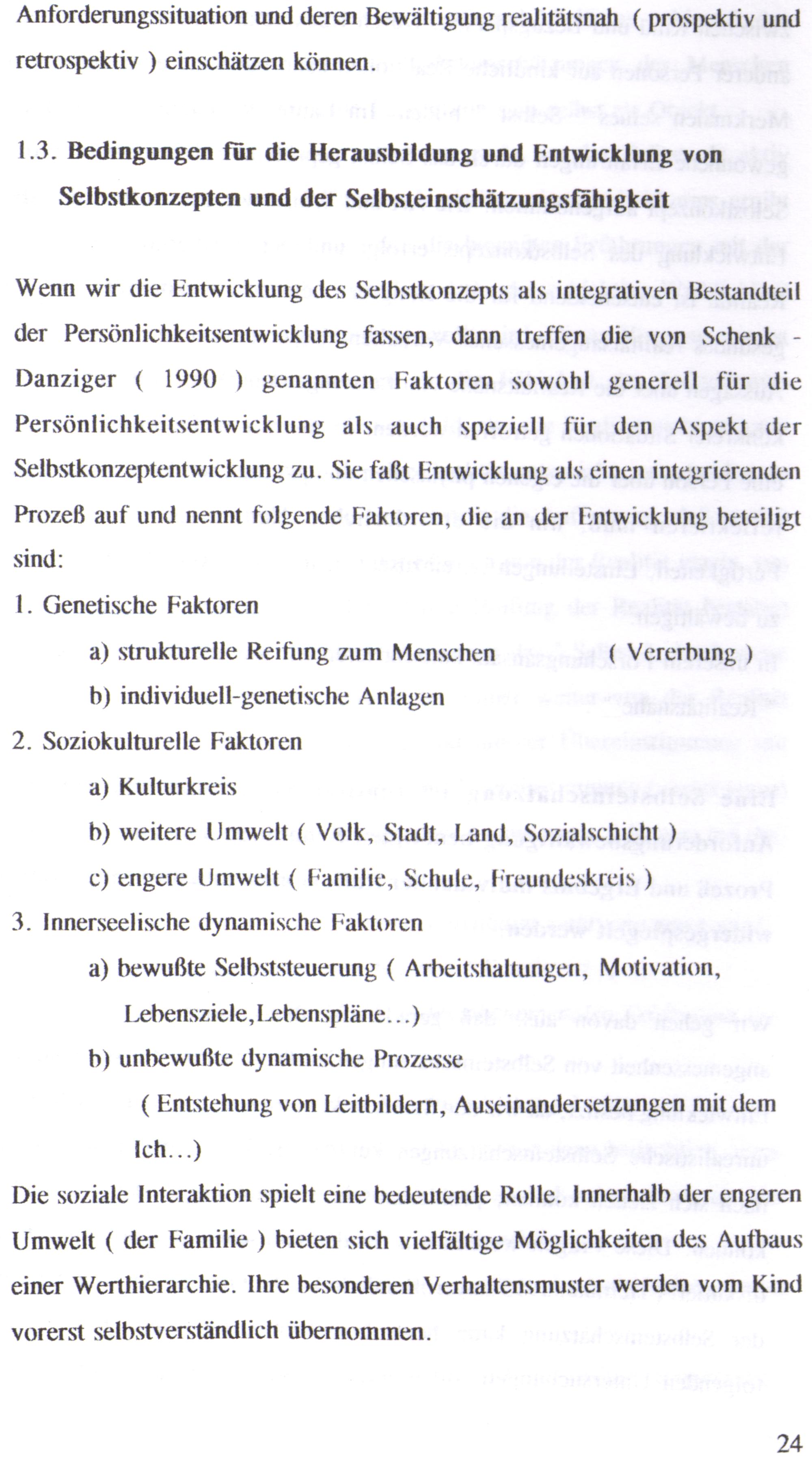 Wenn wir die Entwicklung des Selbstkonzepts als integrativen Bestandteil der Persönlichkeitsentwicklung fassen, dann treffen die von Schenk Danziger( 1990) genannten Faktoren sowohl generell für die Persönlichkeitsentwicklung als auch speziell für den Aspekt der Selbstkonzeptentwicklung zu. Sie faßt Entwicklung als einen integrierenden Prozeß auf und nennt folgende Faktoren, die an der Entwicklung beteiligt sind: 1. Genetische Faktoren
