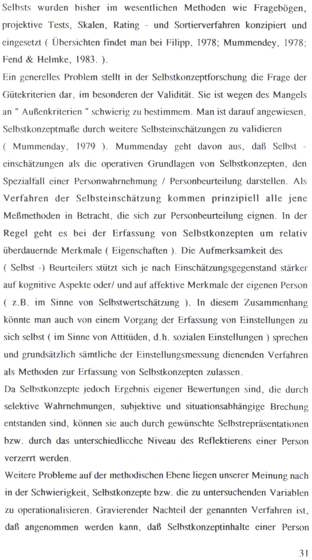 Selbsts wurden bisher im wesentlichen Methoden wie Fragebögen, projektive Tests, Skalen, Rating- und Sortierverfahren konzipiert und eingesetzt( Übersichten findet man bei Filipp, 1978; Mummendey, 1978; Fend& Helmke, 1983.).