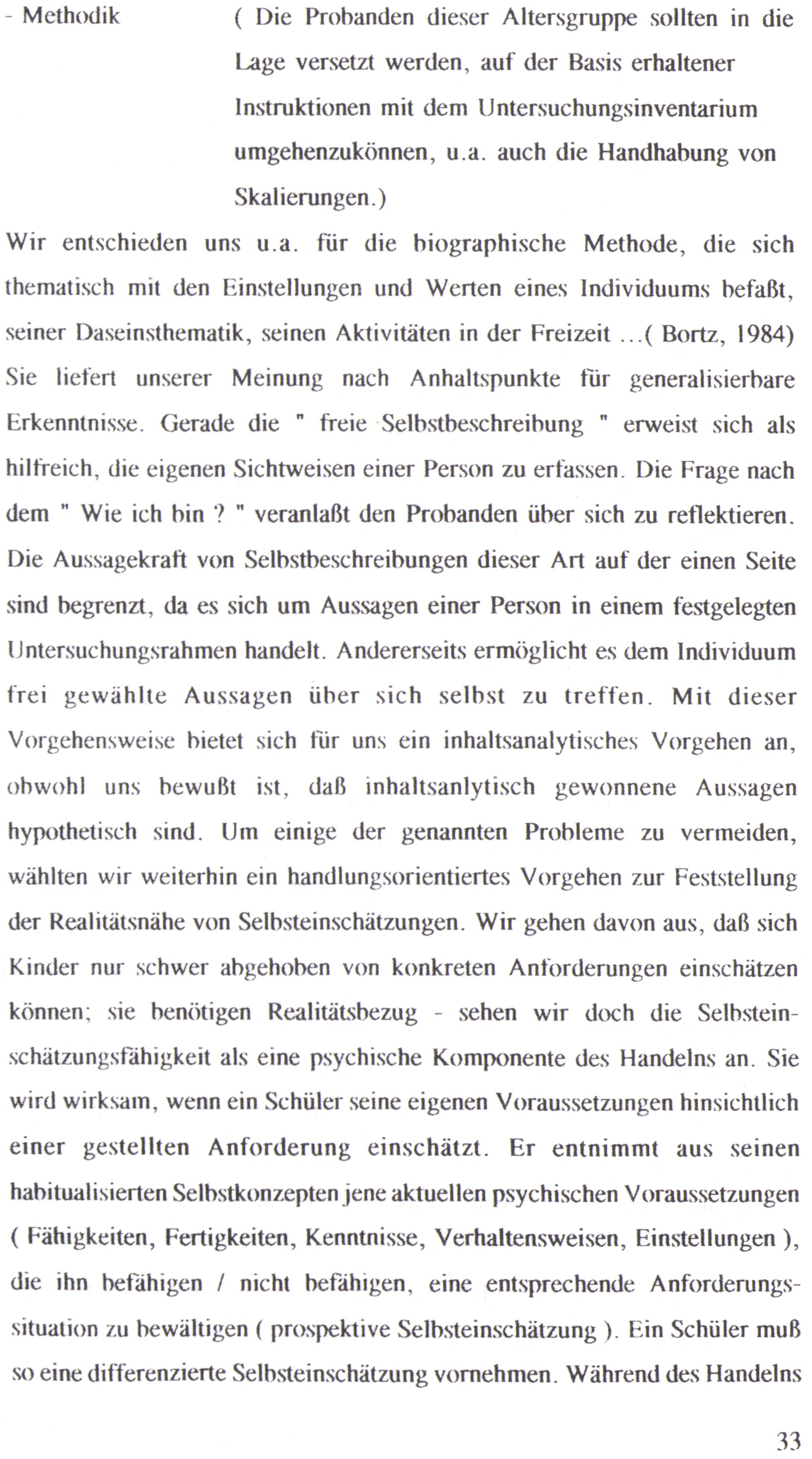 - Methodik( Die Probanden dieser Altersgruppe sollten in die Lage versetzt werden, auf der Basıs erhaltener Instruktionen mit dem Untersuchungsinventarium umgehenzukönnen, u.a. auch die Handhabung von Skalierungen.) Wir entschieden uns u.a. für die biographische Methode, die sich thematisch mit den Einstellungen und Werten eines Individuums befaßt, seiner Daseinsthematik, seinen Aktivitäten in der Freizeit...( Bortz, 1984) Sie liefert unserer Meinung nach Anhaltspunkte für generalisierbare Erkenntnisse. Gerade die" freie Selbstbeschreibung" erweist sich als hilfreich, die eigenen Sichtweisen einer Person zu erfassen. Die Frage nach dem" Wie ich bin?" veranlaßt den Probanden über sich zu reflektieren. Die Aussagekraft von Selbstbeschreibungen dieser Art auf der einen Seite sind begrenzt, da es sich um Aussagen einer Person in einem festgelegten Untersuchungsrahmen handelt. Andererseits ermöglicht es dem Individuum frei gewählte Aussagen über sich selbst zu treffen. Mit dieser Vorgehensweise bietet sich für uns ein inhaltsanalytisches Vorgehen an, obwohl uns bewußt ist, daß inhaltsanlytısch gewonnene Aussagen hypothetisch sind. Um einige der genannten Probleme zu vermeiden, wählten wir weiterhin ein handlungsorientiertes Vorgehen zur Feststellung der Realıtätsnähe von Selbsteinschätzungen. Wir gehen davon aus, daß sich Kinder nur schwer abgehoben von konkreten Anforderungen einschätzen können; sie benötigen Realitätsbezug- sehen wir doch die Selbsteinschätzungsfähigkeit als eine psychische Komponente des Handelns an. Sie wird wirksam, wenn ein Schüler seine eigenen Voraussetzungen hinsichtlich einer gestellten Anforderung einschätzt. Er entnimmt aus seinen habitualisierten Selbstkonzepten jene aktuellen psychischen Voraussetzungen ( Fähigkeiten, Fertigkeiten, Kenntnisse, Verhaltensweisen, Einstellungen), die ihn befähigen/ nicht befähigen, eine entsprechende Anforderungssıtuation zu bewältigen( prospektive Selbsteinschätzung). Ein Schüler muß