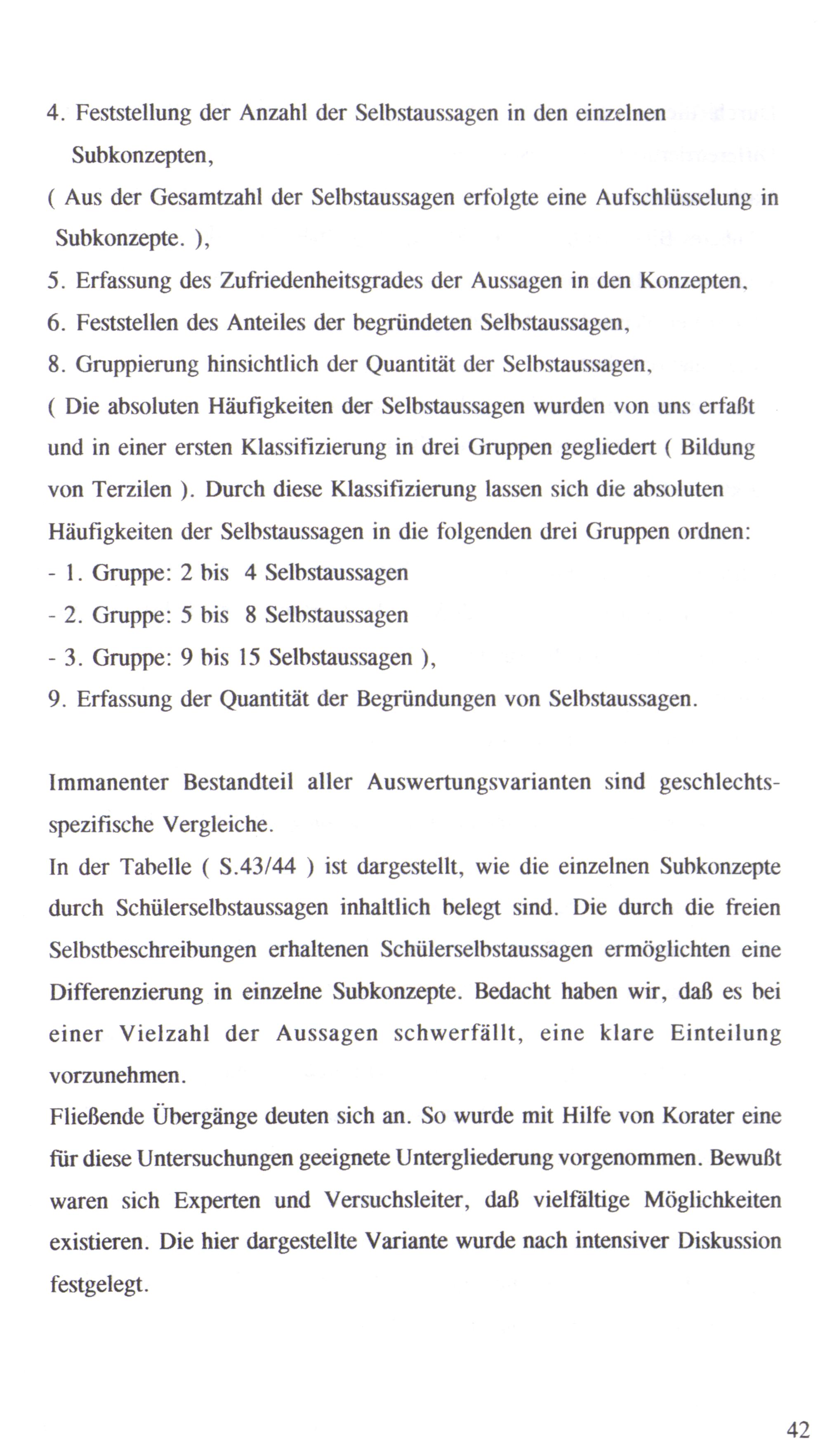In der Tabelle( S.43/44) ist dargestellt, wie die einzelnen Subkonzepte durch Schülerselbstaussagen inhaltlich belegt sind. Die durch die freien Selbstbeschreibungen erhaltenen Schülerselbstaussagen ermöglichten eine Differenzierung in einzelne Subkonzepte. Bedacht haben wir, daß es bei einer Vielzahl der Aussagen schwerfällt, eine klare Einteilung vorzunehmen.