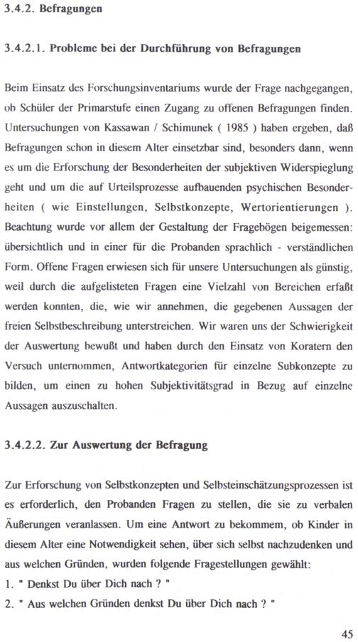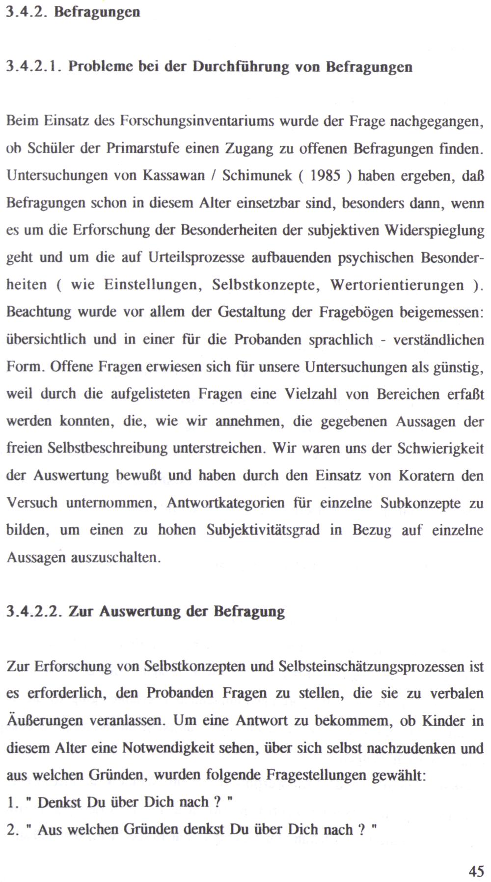 Beim Einsatz des Forschungsinventariums wurde der Frage nachgegangen, ob Schüler der Primarstufe einen Zugang zu offenen Befragungen finden. Untersuchungen von Kassawan/ Schimunek( 1985) haben ergeben, daß Befragungen schon in diesem Alter einsetzbar sind, besonders dann, wenn es um die Erforschung der Besonderheiten der subjektiven Widerspieglung geht und um die auf Urteilsprozesse aufbauenden psychischen Besonderheiten( wie Einstellungen, Selbstkonzepte, Wertorientierungen). Beachtung wurde vor allem der Gestaltung der Fragebögen beigemessen: übersichtlich und in einer für die Probanden sprachlich- verständlichen Form. Offene Fragen erwiesen sich für unsere Untersuchungen als günstig, weil durch die aufgelisteten Fragen eine Vielzahl von Bereichen erfaßt werden konnten, die, wie wir annehmen, die gegebenen Aussagen der freien Selbstbeschreibung unterstreichen. Wir waren uns der Schwierigkeit der Auswertung bewußt und haben durch den Einsatz von Koratern den Versuch unternommen, Antwortkategorien für einzelne Subkonzepte zu bilden, um einen zu hohen Subjektivitätsgrad in Bezug auf einzelne