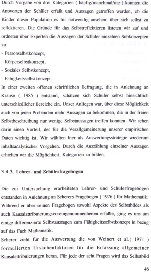 Die zur Untersuchung erarbeiteten Lehrer- und Schülerfragebögen entstanden in Anlehnung an Scherers Fragebogen( 1976) für Mathematik. Während er über seinen Fragebogen sowohl Aspekte des Selbstbildes als auch Kausalattribuierungsvoreingenommenheiten erfaßte, ging es uns um einige differenzierte Selbstaussagen zum Fähigkeitsselbstkonzept in bezug auf das Fach Mathematik.