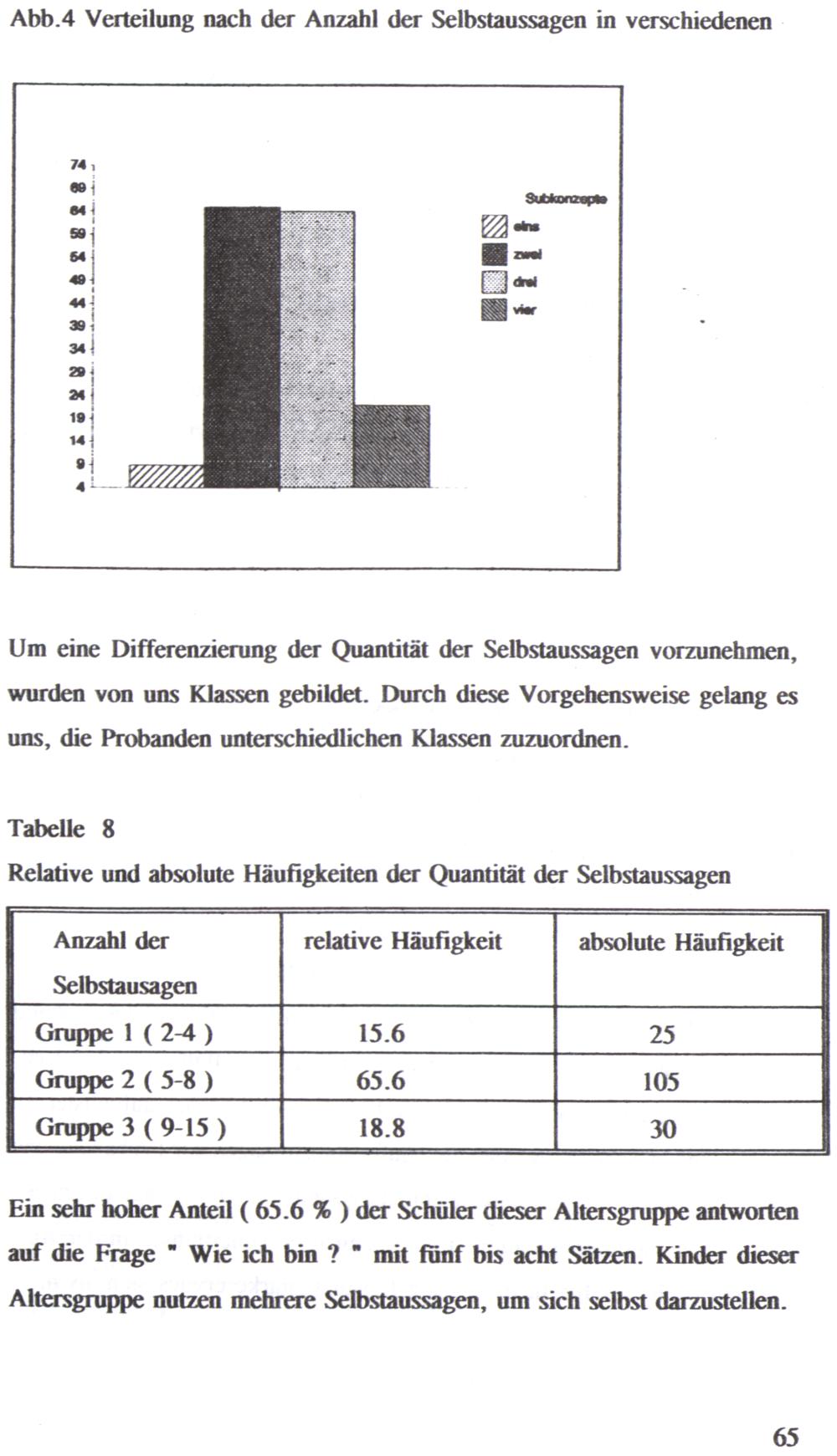 Ein sehr hoher Anteil( 65.6%) der Schüler dieser Altersgruppe antworten auf die Frage” Wie ich bin?" mit fünf bis acht Sätzen. Kinder dieser Altersgruppe nutzen mehrere Selbstaussagen, um sich selbst darzustellen.