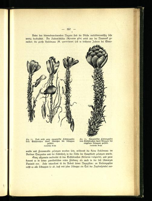 Gan; allgemein verbreitet ist das Eichhörnchen (Keinrns vulgaris), und zwar kommt es in seiner gewöhnlichen roten Färbung als auch in der fast schwarzen Varietät vor. Lehr interessant ist die Arbeit seiner Nagezähne: an Kiefernzapfen reißt es alle Lchuppen so ab, daß mit jeder Lchuppe ein Teil der Zapfenspindel ver-
