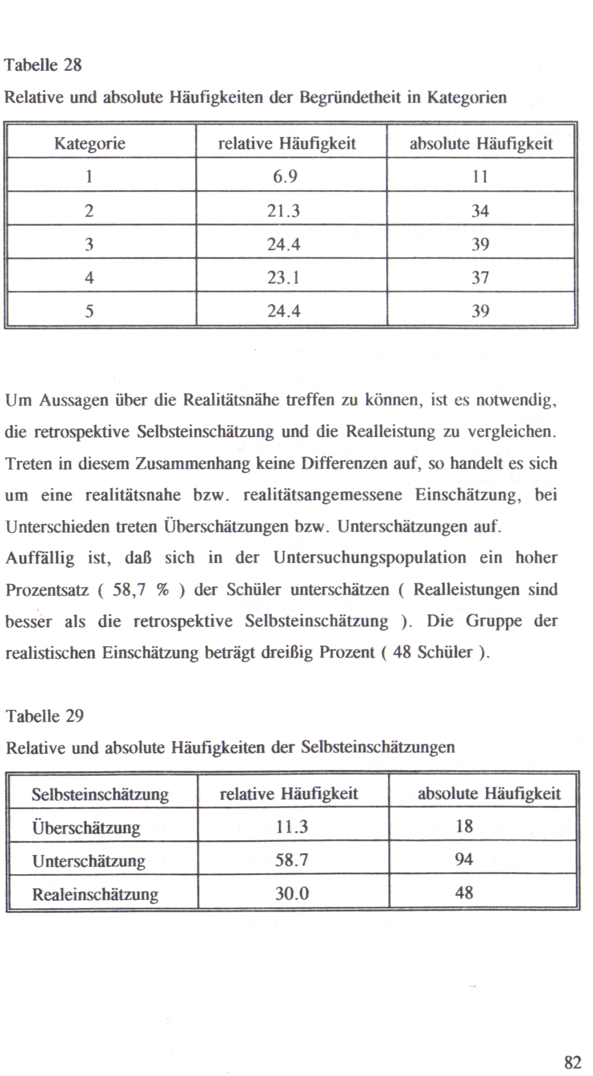 Um Aussagen über die Realitätsnähe treffen zu können, ist es notwendig, die retrospektive Selbsteinschätzung und die Realleistung zu vergleichen. Treten in diesem Zusammenhang keine Differenzen auf, so handelt es sich um eine realitätsnahe bzw. realitätsangemessene Einschätzung, bei Unterschieden treten Überschätzungen bzw. Unterschätzungen auf. Auffällig ist, daß sich in der Untersuchungspopulation ein hoher Prozentsatz( 58,7%) der Schüler unterschätzen( Realleistungen sind besser als die retrospektive Selbsteinschätzung). Die Gruppe der realistischen Einschätzung beträgt dreißig Prozent( 48 Schüler).
