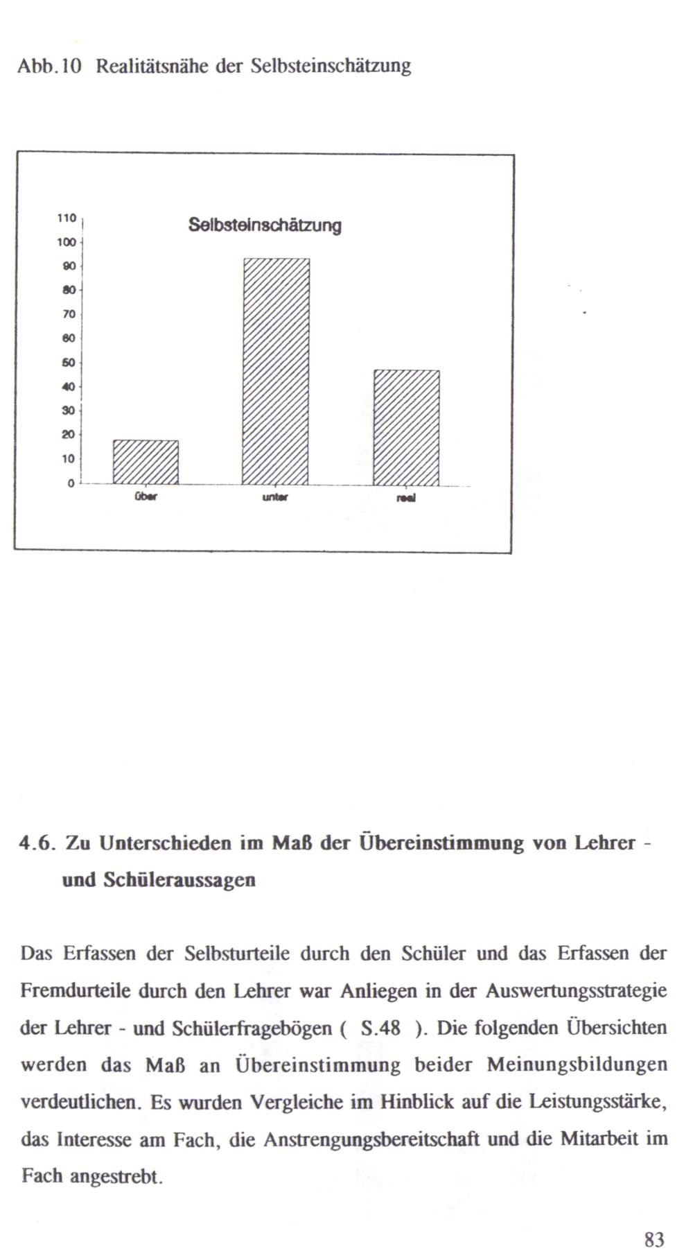 Das Erfassen der Selbsturteile durch den Schüler und das Erfassen der Fremdurteile durch den Lehrer war Anliegen in der Auswertungsstrategie der Lehrer- und Schülerfragebögen( S.48). Die folgenden Übersichten werden das Maß an Übereinstimmung beider Meinungsbildungen verdeutlichen. Es wurden Vergleiche im Hinblick auf die Leistungsstärke, das Interesse am Fach, die Anstrengungsbereitschaft und die Mitarbeit im Fach angestrebt.