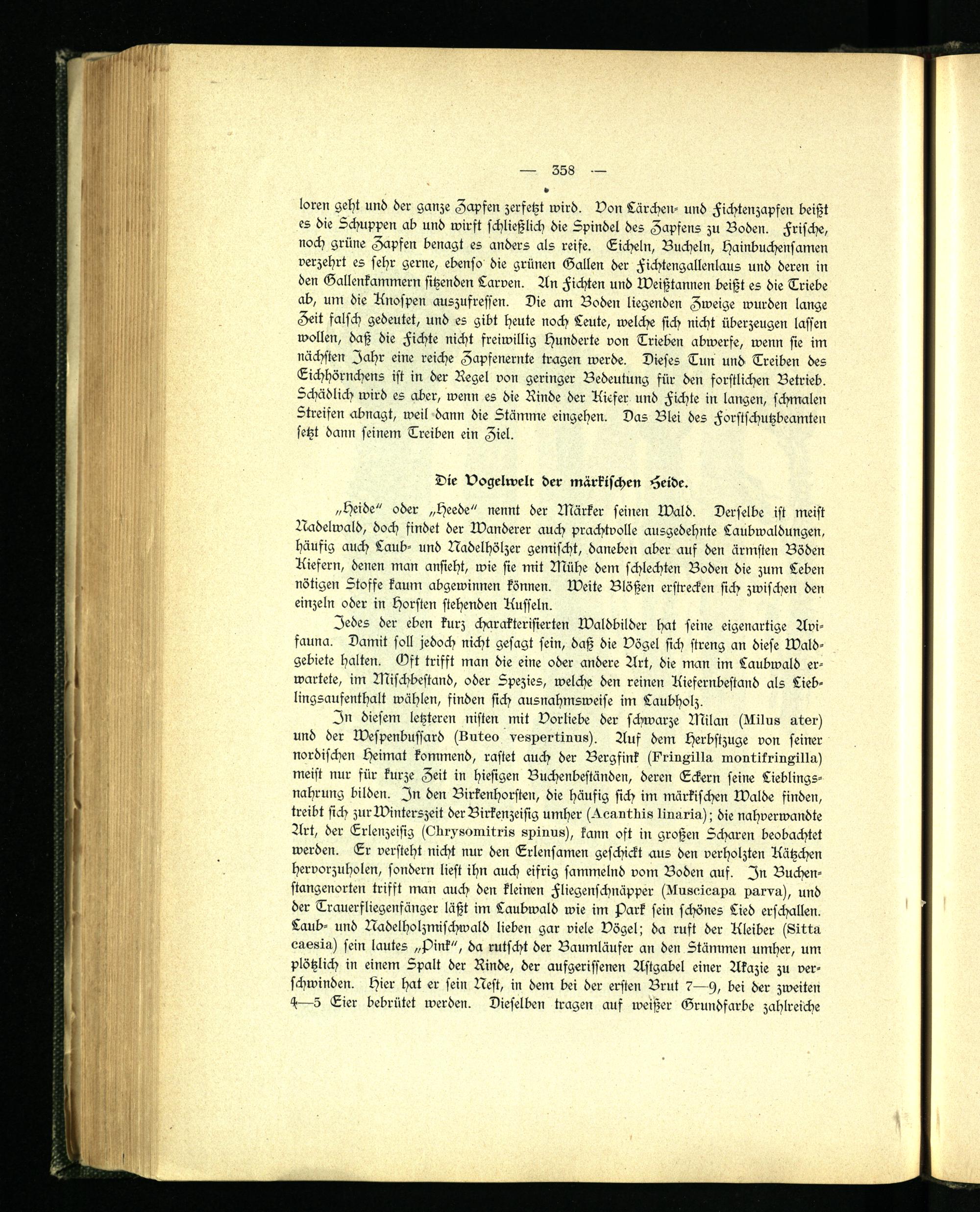 Jedes der eben kurz charakterisierten Waldbilder hat seine eigenartige Avifauna. Damit soll jedoch nicht gesagt sein, daß die Vögel sich streng an diese Waldgebiete halten. Vst trifft man die eine oder andere Art, die man im Laubwald erwartete, im Mischbestand, oder Spezies, welche den reinen Kiefernbestand als Lieblingsaufenthalt wählen, finden sich ausnahmsweise im Laubholz.