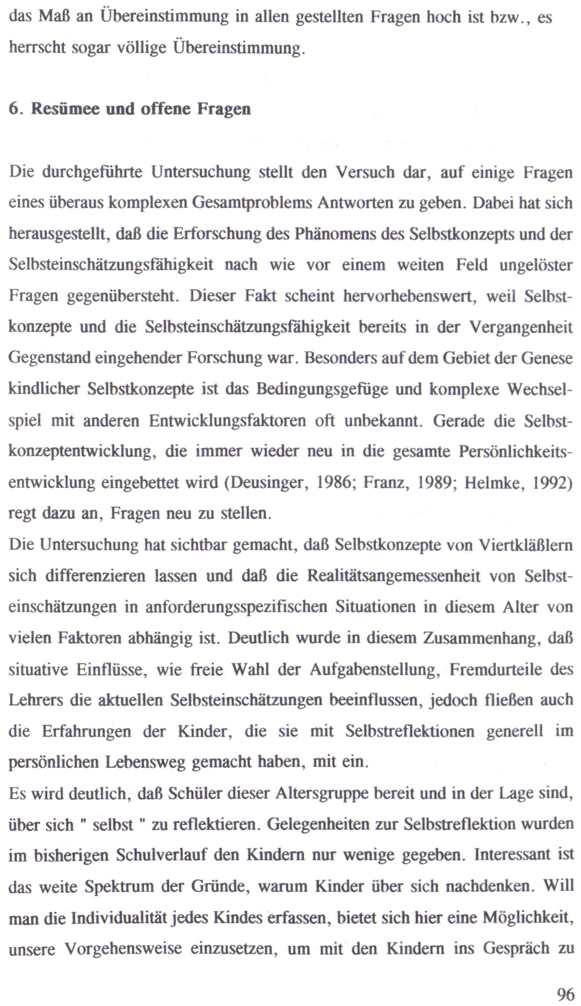 Die durchgeführte Untersuchung stellt den Versuch dar, auf einige Fragen eines überaus komplexen Gesamtproblems Antworten zu geben. Dabei hat sich herausgestellt, daß die Erforschung des Phänomens des Selbstkonzepts und der Selbsteinschätzungsfähigkeit nach wie vor einem weiten Feld ungelöster Fragen gegenübersteht. Dieser Fakt scheint hervorhebenswert, weil Selbstkonzepte und die Selbsteinschätzungsfähigkeit bereits in der Vergangenheit Gegenstand eingehender Forschung war. Besonders auf dem Gebiet der Genese kindlicher Selbstkonzepte ist das Bedingungsgefüge und komplexe Wechselspiel mit anderen Entwicklungsfaktoren oft unbekannt. Gerade die Selbstkonzeptentwicklung, die immer wieder neu in die gesamte Persönlichkeitsentwicklung eingebettet wird(Deusinger, 1986; Franz, 1989; Helmke, 1992) regt dazu an, Fragen neu zu stellen.
