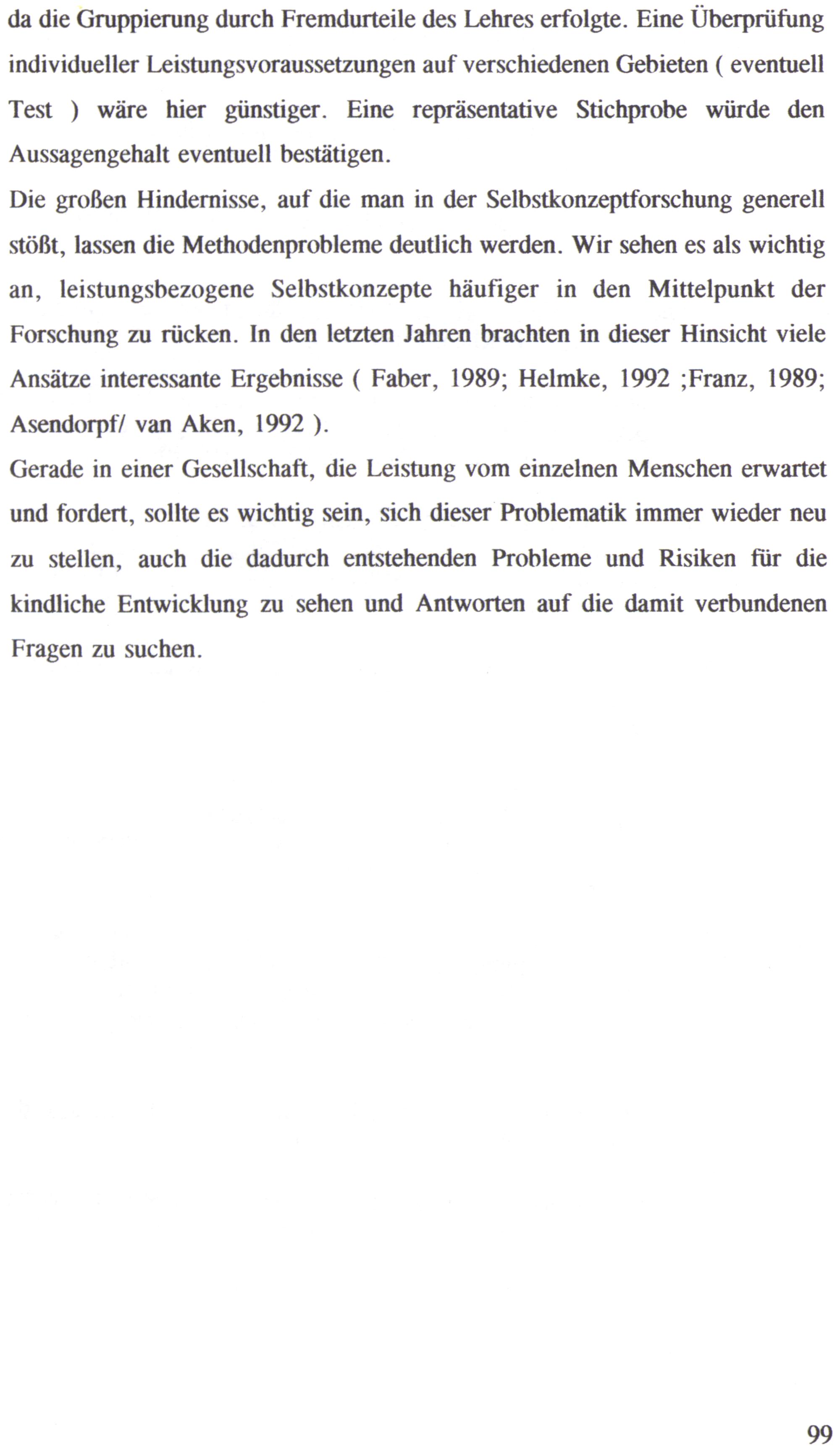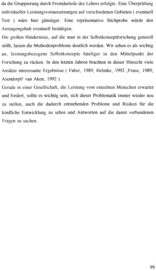 Die großen Hindernisse, auf die man in der Selbstkonzeptforschung generell stößt, lassen die Methodenprobleme deutlich werden. Wir sehen es als wichtig an, leistungsbezogene Selbstkonzepte häufiger in den Mittelpunkt der Forschung zu rücken. In den letzten Jahren brachten in dieser Hinsicht viele Ansätze interessante Ergebnisse( Faber, 1989; Helmke, 1992;Franz, 1989; Asendorpf/ van Aken, 1992).