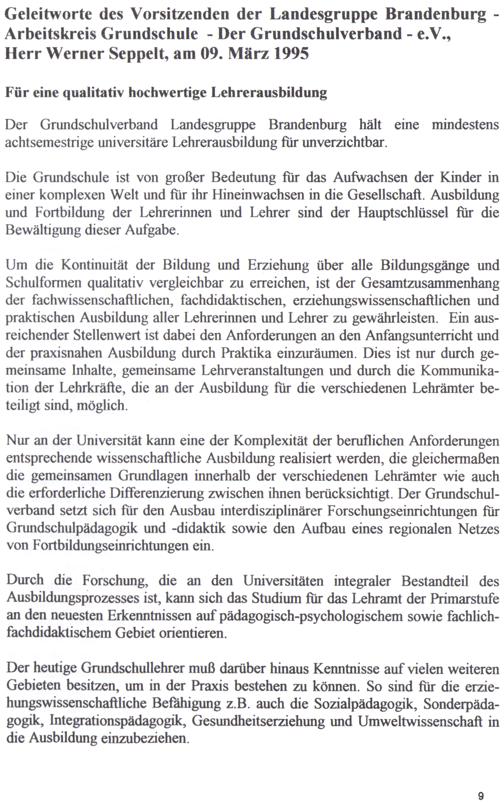 Geleitworte des Vorsitzenden der Landesgruppe Brandenburg Arbeitskreis Grundschule- Der Grundschulverband- e.V., Herr Werner Seppelt, am 09. März 1995