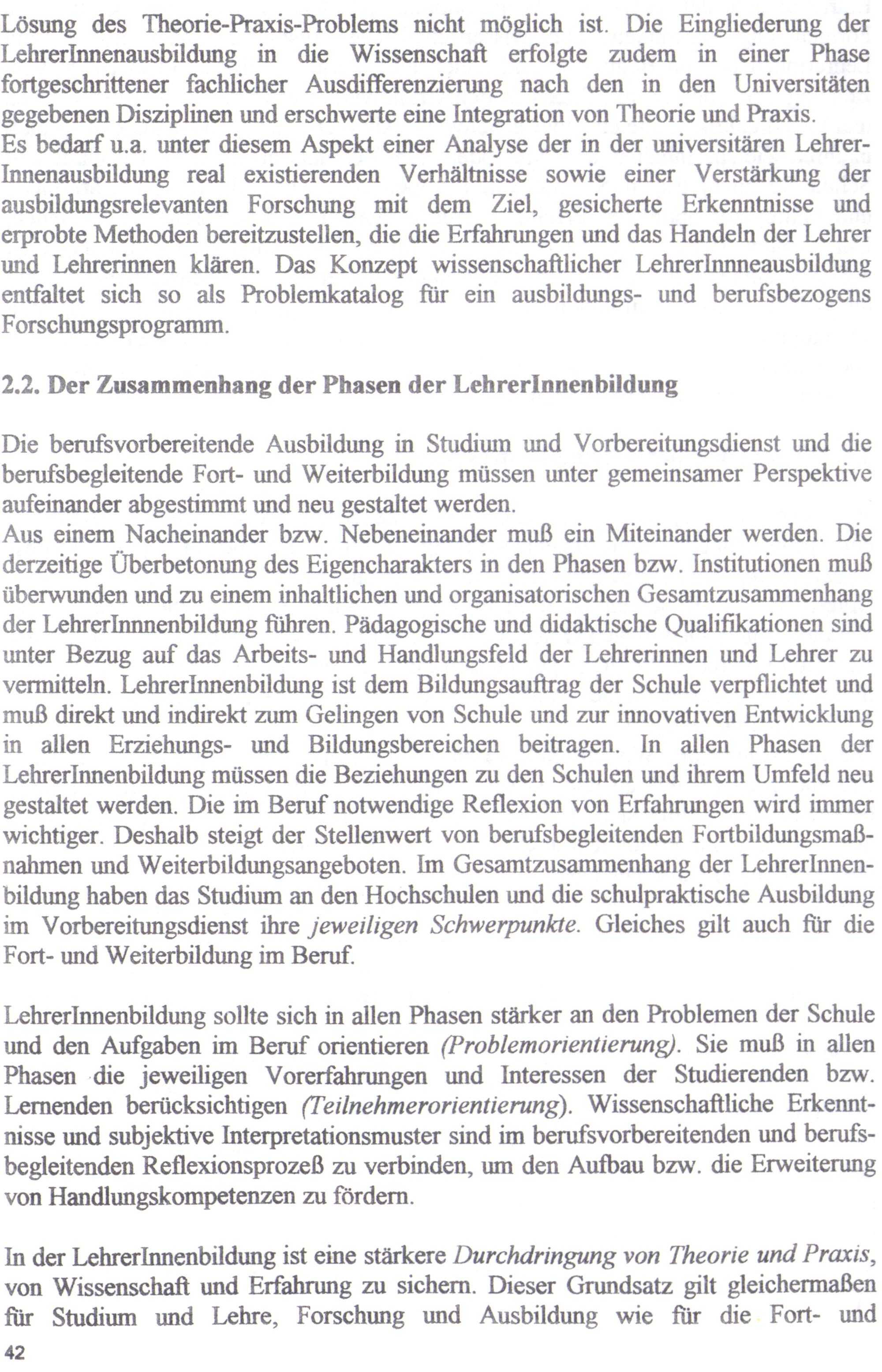 In der LehrerInnenbildung ist eine stärkere Durchdringung von Theorie und Praxis, von Wissenschaft und Erfahrung zu sichern. Dieser Grundsatz gilt gleichermaßen für Studium und Lehre, Forschung und Ausbildung wie für die Fort- und
