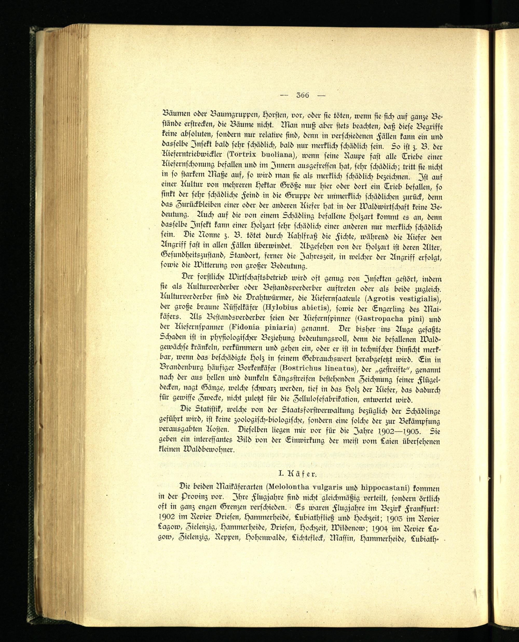 Die beiden Maikäferarten (Ltslolontba vulgaris und blppooastuni) kommen in der Provinz vor. Ihre Flugjahre sind nicht gleichmäßig verteilt, sondern örtlich oft in ganz engen Grenzen verschieden. Es waren Flugjahre im Bezirk Frankfurt: 1902 im Revier Driesen, Hammerheide, Lubiathfließ und Hochzeit; IHOZ im Revier Lagow, Zielenzig, Hammerheide, Driesen, Hochzeit, Wildenow; fyO-s im Revier La- gow, Zielenzig, Reppen, hohenwalde, Lichtefleck, Massin, Hammerheide, Lubiath-