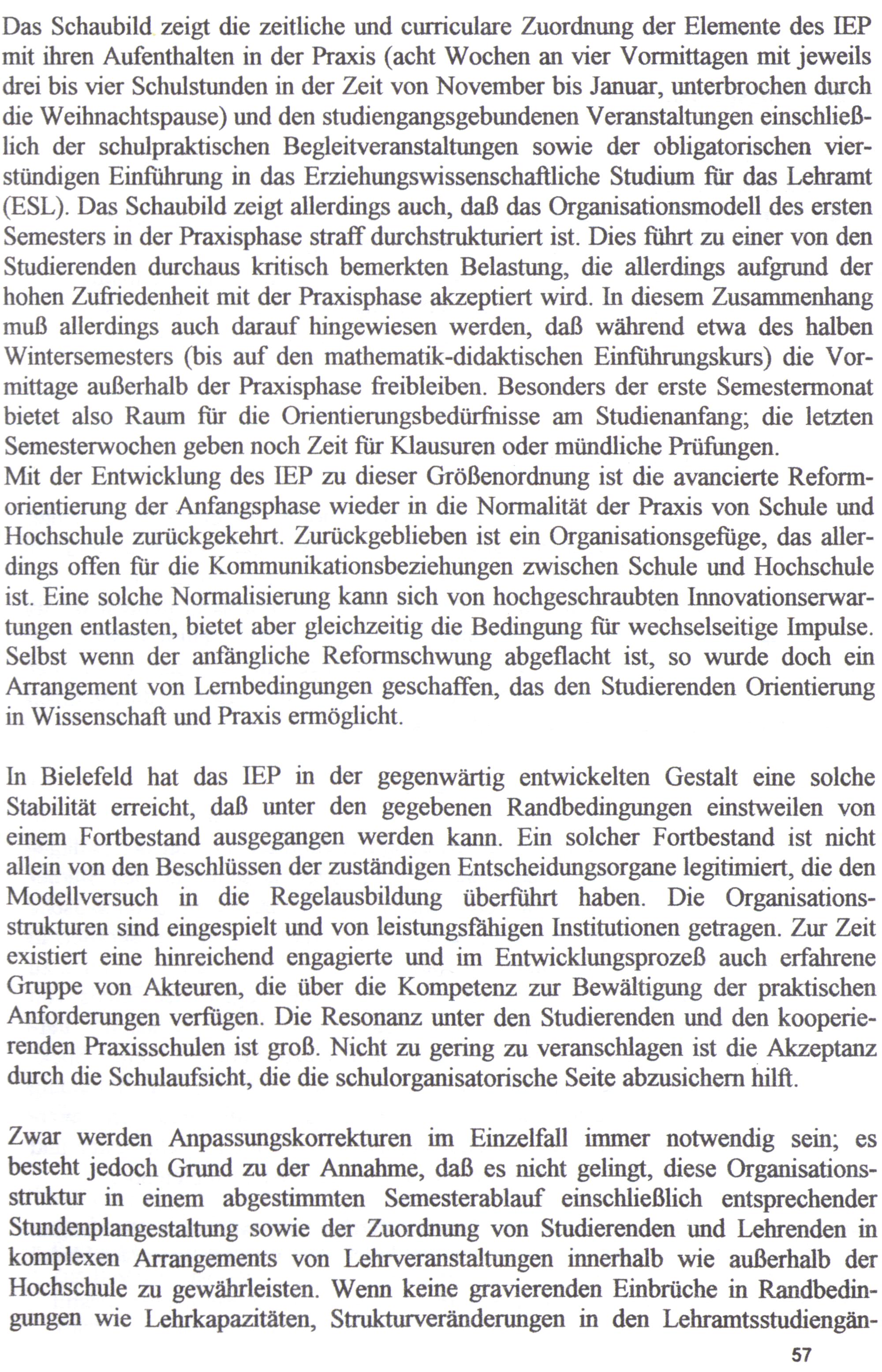 In Bielefeld hat das IEP ın der gegenwärtig entwickelten Gestalt eine solche Stabilität erreicht, daß unter den gegebenen Randbedingungen einstweilen von einem Fortbestand ausgegangen werden kann. Ein solcher Fortbestand ist nicht allein von den Beschlüssen der zuständigen Entscheidungsorgane legitimiert, die den Modellversuch in die Regelausbildung überführt haben. Die Organisationsstrukturen sind eingespielt und von leistungsfähigen Institutionen getragen. Zur Zeit existiert eine hinreichend engagierte und im Entwicklungsprozeß auch erfahrene Gruppe von Akteuren, die über die Kompetenz zur Bewältigung der praktischen Anforderungen verfügen. Die Resonanz unter den Studierenden und den kooperierenden Praxisschulen ist groß. Nicht zu gering zu veranschlagen ist die Akzeptanz durch die Schulaufsicht, die die schulorganisatorische Seite abzusichern hilft.