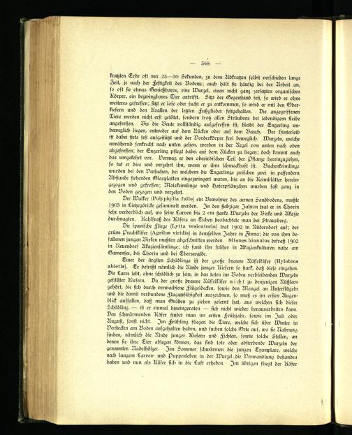 Einer der ärgsten Schädlinge ist der große braune Rüsselkäfer (DIlobius adletis). Lr befrißt nämlich die Rinde junger Kiefern so stark, daß diese eingehen. Die Larre lebt, ohne schädlich zu sein, in den toten im Boden verbleibenden Wurzeln gefällter Kiefern. Da der große braune Rüsselkäfer nicht zu denjenigen Rüßlern gehört, die sich durch verwachsene Flügeldecken, sowie den Mangel an Anterflügeln und die damit verbundene Flugunfähigkeit auszeichnen, so muß es im ersten Augenblick auffallen, däß man Gräben zu ziehen gelernt hat, aus welchen sich dieser Schädling — ist er einmal hineingeraten — sich nicht wieder herausarbeiten kann. Den schwärmenden Käfer findet man im ersten Frühjahr, sowie im Juli oder August, sonst nicht. Im Frühling fliegen die Tiere, welche sich über Winter in Verstecken am Boden aufgehalten haben, und sucken solche Orte auf, wo sie Nahrung finden, nämlich die Rinde junger Kiefern und Fichten, sowie solche Stellen, an denen sie ihre Eier ablegen können, das sind tote oder absterbende Wurzeln der genannten Nadelhölzer. Im Sommer schwärmen die jungen Exemplare, welche nach langem Larven- und Puppenleben in der Wurzel die Verwandlung bestanden haben und nun als Käfer sich in die Luft erheben. Im übrigen fliegt der Käfer