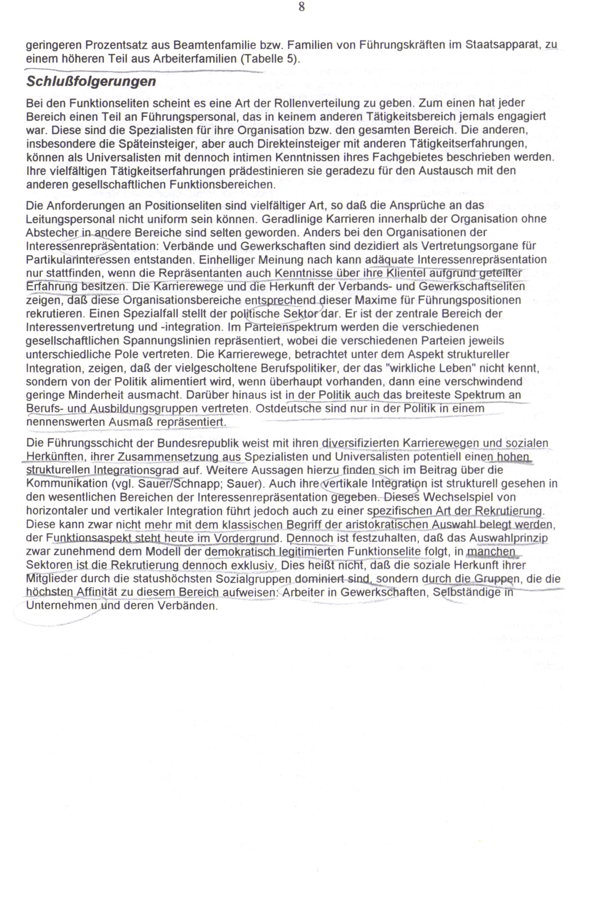 Die Führungsschicht der Bundesrepublik weist mit ihren diversifizierten Karrierewegen und sozialen _Herkünften, ihrer Zusammensetzung. aus Spezialisten und Universalisten potentiell einen hohen. "strukturellen ı Integrationsgrad auf. Weitere Aussagen hierzu finden sich im Beitrag über die M Kommunikation(vgl. Sauer/Schnapp; Sauer). Auch ihre«Vertikale Integration ist strukturell gesehen in den wesentlichen Bereichen der Interessenrepräsentation gegeben.-Dieses Wechselspiel von horizontaler und vertikaler Integration führt jedoch auch zu einer spezifischen Art der Rekrutierung. Diese kann zwar nicht mehr mit dem klassischen Begriff der aristokratischen Auswahl.belegt werden, der Funktionsaspekt steht heute im Vordergrund. Dennoch ist festzuhalten, daß das Auswahlprinzip zwar zunehmend dem Modell der demokratisch legitimierten Funktionselite folgt, in