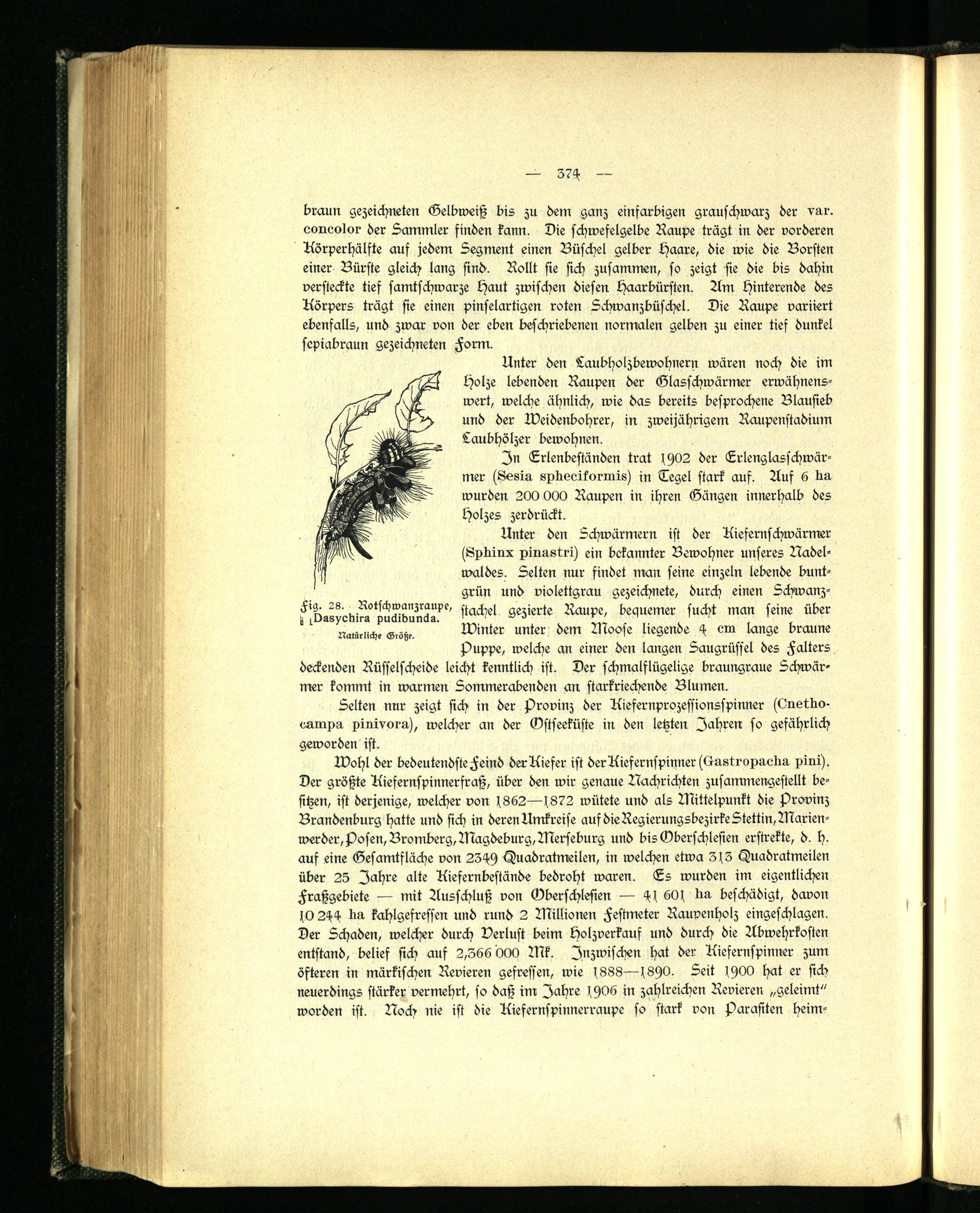 Wohl der bedeutendste Feind der Kiefer ist der Kiefernspinner (Oastropuclm pini). Der größte Kiefernspinnerfraß, über den wir genaue Nachrichten zusammengestellt besitzen, ist derjenige, welcher von f862—1872 wütete und als Mittelpunkt die Provinz Brandenburg hatte und sich in deren Umkreise auf dieRegierungsbezirkeStettin,Marienwerder, Posen, Bromberg, Magdeburg, Merseburg und bisGberschlesien erstrekte, d. h. auf eine Gesamtfläche von 234h Tuadratmeilen, in welchen etwa 31,3 (Iuadratmeilen über 25 Jahre alte Kiefernbestände bedroht waren. Es wurden im eigentlichen Fraßgebiete — mit Ausschluß von Dberschlesien — 41, 601 tm beschädigt, davon 10 244 Im kahlgefressen und rund 2 Millionen Festmeter Rauvenholz eingeschlagen. Der Schaden, welcher durch Verlust beim holzverkauf und durch die Abwehrkosten entstand, belief sich auf 2,366 000 Mk. Inzwischen hat der Kiefernspinner zum öfteren in märkischen Revieren gefressen, wie 1888—18stO. Seit 1HOO hat er sich neuerdings stärker vermehrt, so daß im Jahre fst06 in zahlreichen Revieren „geleimt" worden ist. Noch nie ist die Kiefernspinnerraupe so stark von Parasiten heim-