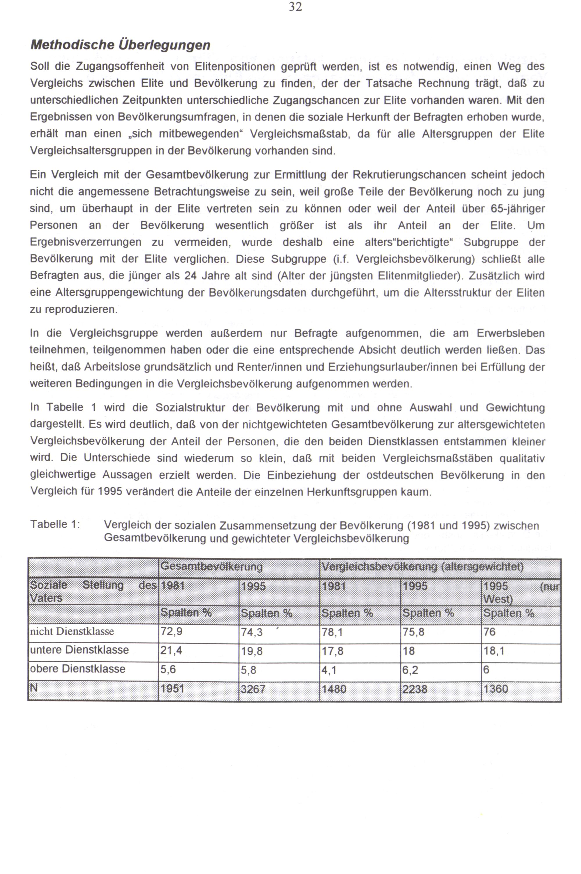 Soll die Zugangsoffenheit von Elitenpositionen geprüft werden, ist es notwendig, einen Weg des Vergleichs zwischen Elite und Bevölkerung zu finden, der der Tatsache Rechnung trägt, daß zu unterschiedlichen Zeitpunkten unterschiedliche Zugangschancen zur Elite vorhanden waren. Mit den Ergebnissen von Bevölkerungsumfragen, in denen die soziale Herkunft der Befragten erhoben wurde, erhält man einen„sich mitbewegenden“ Vergleichsmaßstab, da für alle Altersgruppen der Elite Vergleichsaltersgruppen in der Bevölkerung vorhanden sind.
