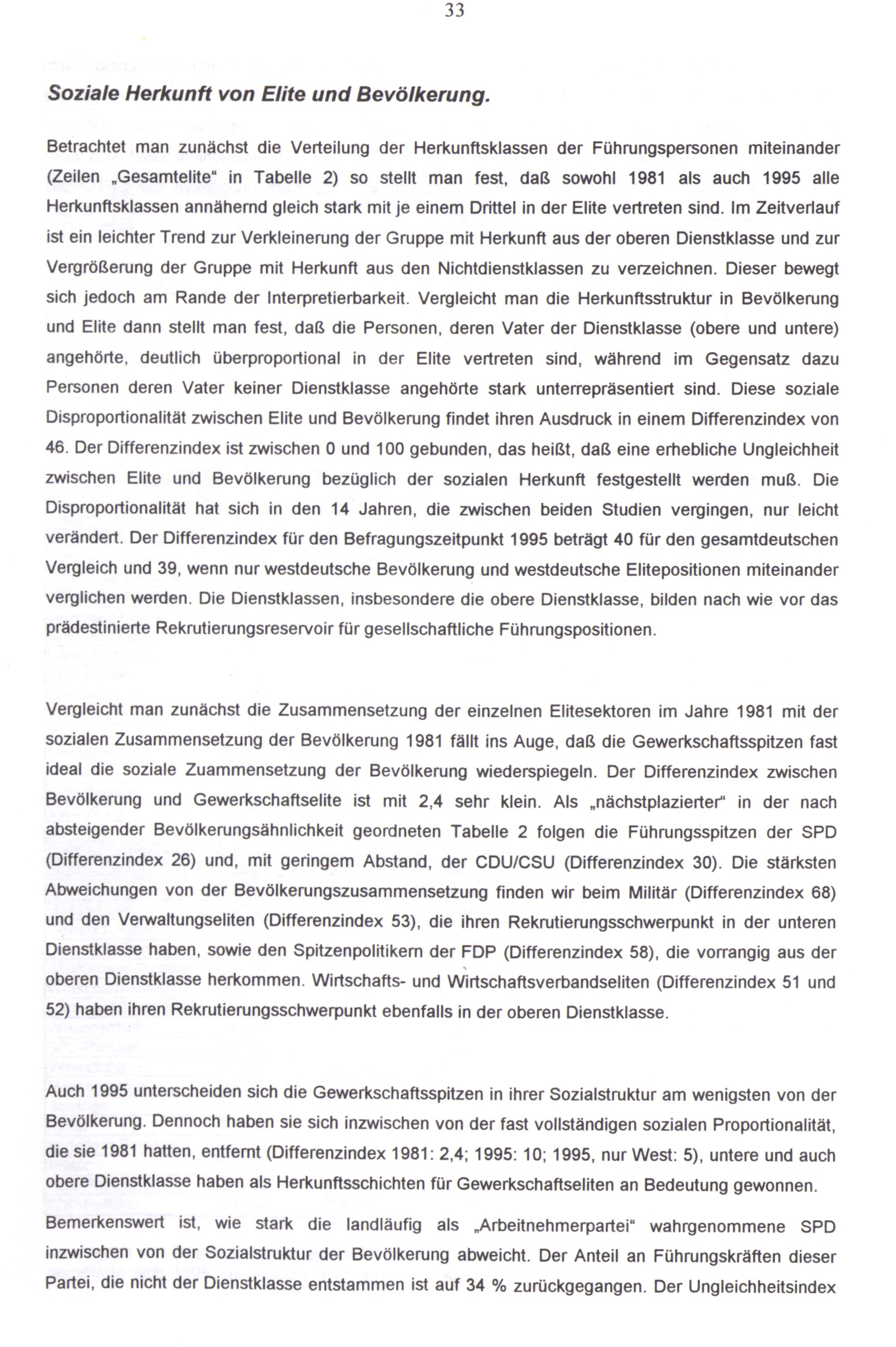 Auch 1995 unterscheiden sich die Gewerkschaftsspitzen in ihrer Sozialstruktur am wenigsten von der Bevölkerung. Dennoch haben sie sich inzwischen von der fast vollständigen sozialen Proportionalität, die sie 1981 hatten, entfernt(Differenzindex 1981: 2,4; 1995: 10; 1995, nur West: 5), untere und auch obere Dienstklasse haben als Herkunftsschichten für Gewerkschaftseliten an Bedeutung gewonnen.