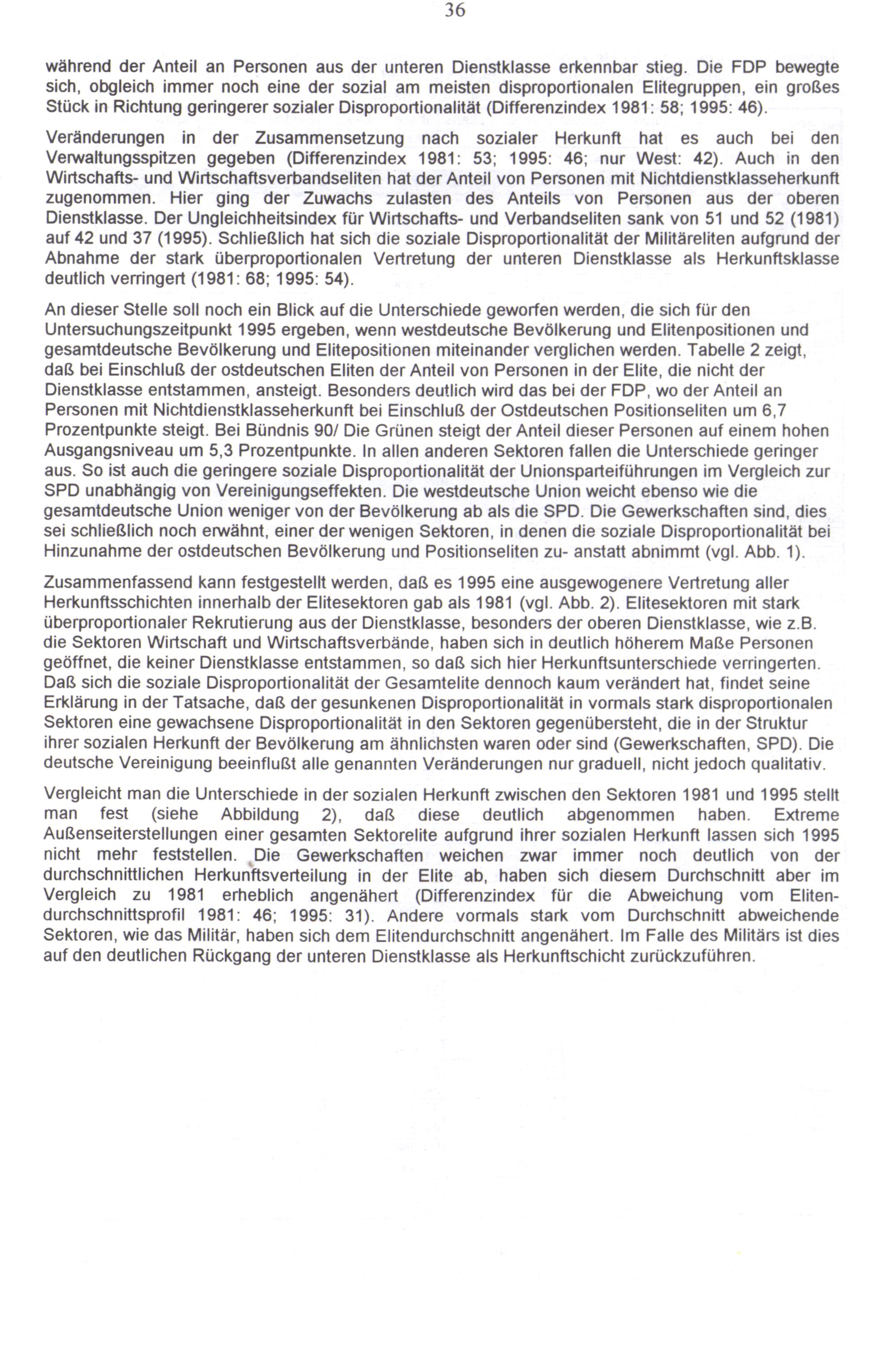Zusammenfassend kann festgestellt werden, daß es 1995 eine ausgewogenere Vertretung aller Herkunftsschichten innerhalb der Elitesektoren gab als 1981(vgl. Abb. 2). Elitesektoren mit stark überproportionaler Rekrutierung aus der Dienstklasse, besonders der oberen Dienstklasse, wie z.B. die Sektoren Wirtschaft und Wirtschaftsverbände, haben sich in deutlich höherem Maße Personen geöffnet, die keiner Dienstklasse entstammen, so daß sich hier Herkunftsunterschiede verringerten. Daß sich die soziale Disproportionalität der Gesamtelite dennoch kaum verändert hat, findet seine Erklärung in der Tatsache, daß der gesunkenen Disproportionalität in vormals stark disproportionalen Sektoren eine gewachsene Disproportionalität in den Sektoren gegenübersteht, die in der Struktur ihrer sozialen Herkunft der Bevölkerung am ähnlichsten waren oder sind(Gewerkschaften, SPD). Die deutsche Vereinigung beeinflußt alle genannten Veränderungen nur graduell, nicht jedoch qualitativ.