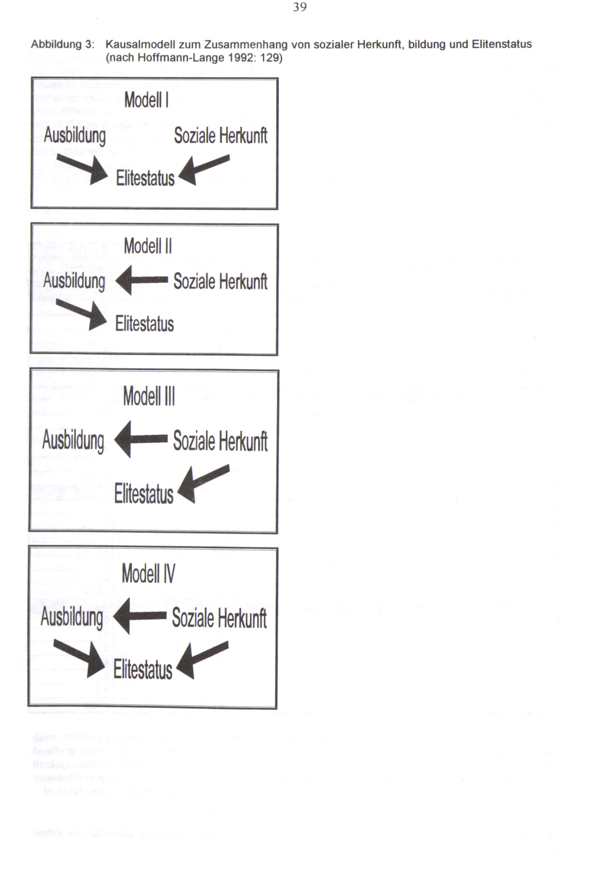 Abbildung 3: Kausalmodell zum Zusammenhang von sozialer Herkunft, bildung und Elitenstatus (nach Hoffmann-Lange 1992: 129)
