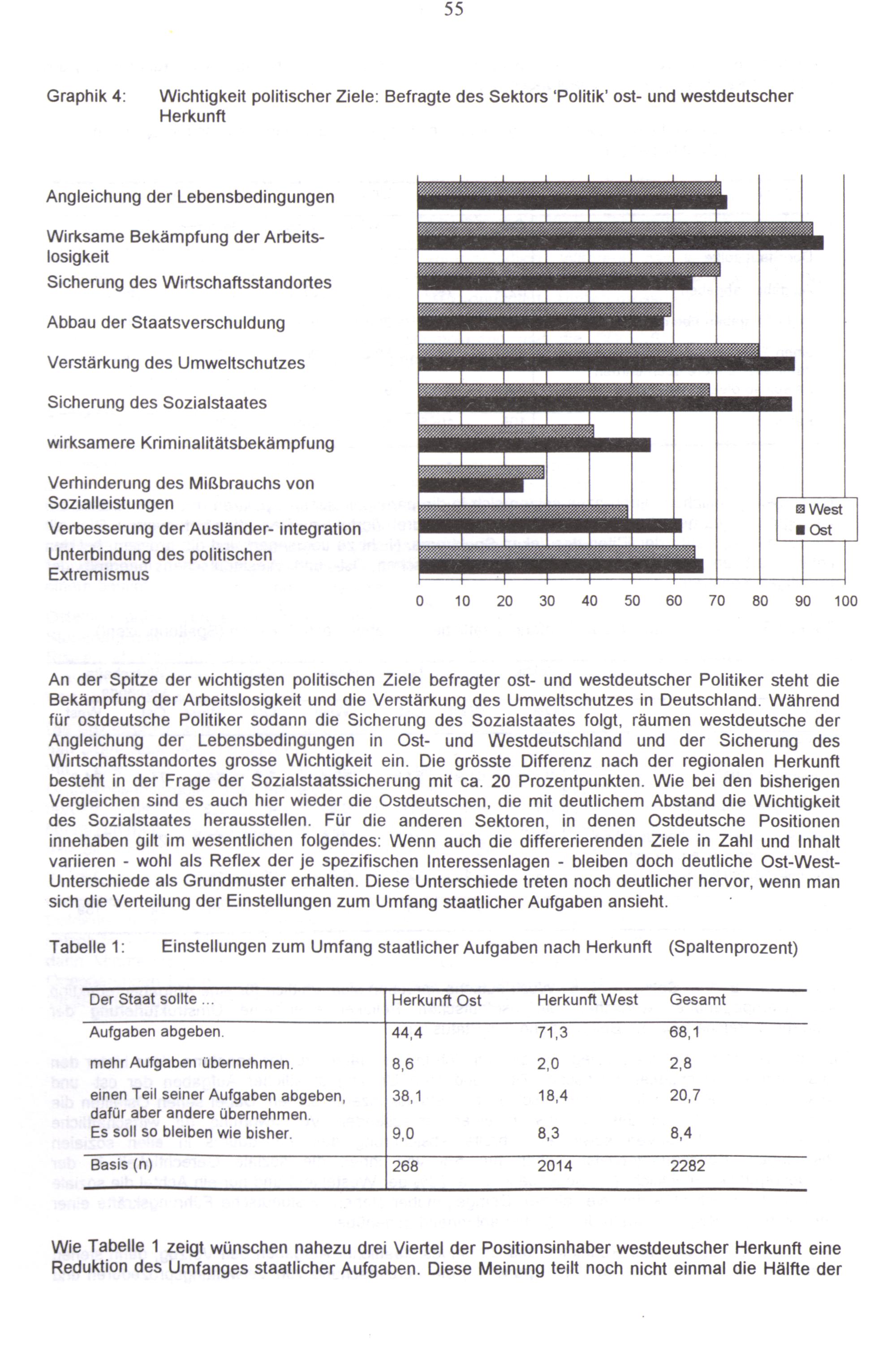 An der Spitze der wichtigsten politischen Ziele befragter ost- und westdeutscher Politiker steht die Bekämpfung der Arbeitslosigkeit und die Verstärkung des Umweltschutzes in Deutschland. Während für ostdeutsche Politiker sodann die Sicherung des Sozialstaates folgt, räumen westdeutsche der Angleichung der Lebensbedingungen in Ost- und Westdeutschland und der Sicherung des Wirtschaftsstandortes grosse Wichtigkeit ein. Die grösste Differenz nach der regionalen Herkunft besteht in der Frage der Sozialstaatssicherung mit ca. 20 Prozentpunkten. Wie bei den bisherigen Vergleichen sind es auch hier wieder die Ostdeutschen, die mit deutlichem Abstand die Wichtigkeit des Sozialstaates herausstellen. Für die anderen Sektoren, in denen Ostdeutsche Positionen innehaben gilt im wesentlichen folgendes: Wenn auch die differerierenden Ziele in Zahl und Inhalt variieren- wohl als Reflex der je spezifischen Interessenlagen- bleiben doch deutliche Ost-WestUnterschiede als Grundmuster erhalten. Diese Unterschiede treten noch deutlicher hervor, wenn man sich die Verteilung der Einstellungen zum Umfang staatlicher Aufgaben ansieht..