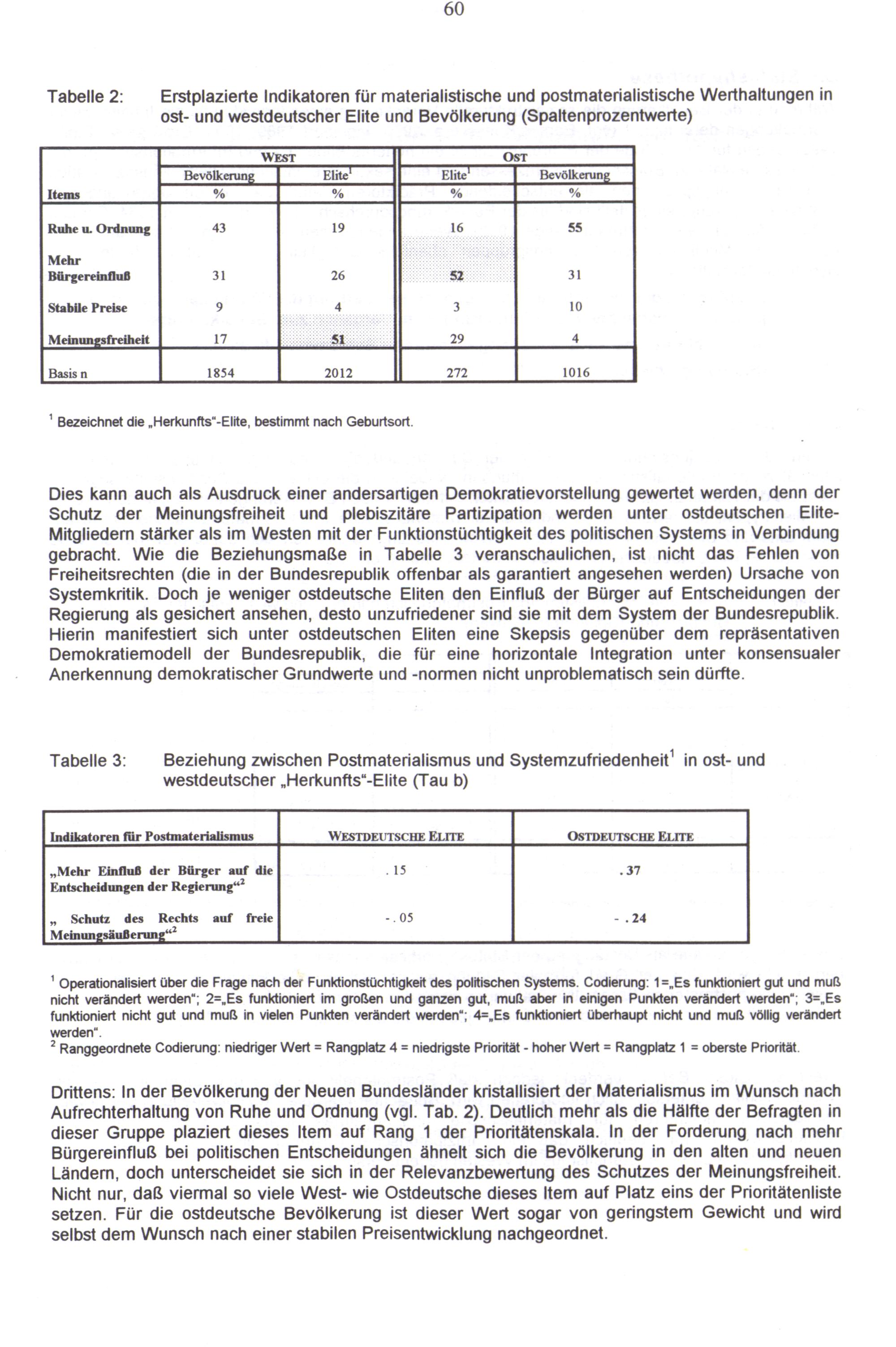 Tabelle 2: Erstplazierte Indikatoren für materialistische und postmaterialistische Werthaltungen in ost- und westdeutscher Elite und Bevölkerung(Spaltenprozentwerte)