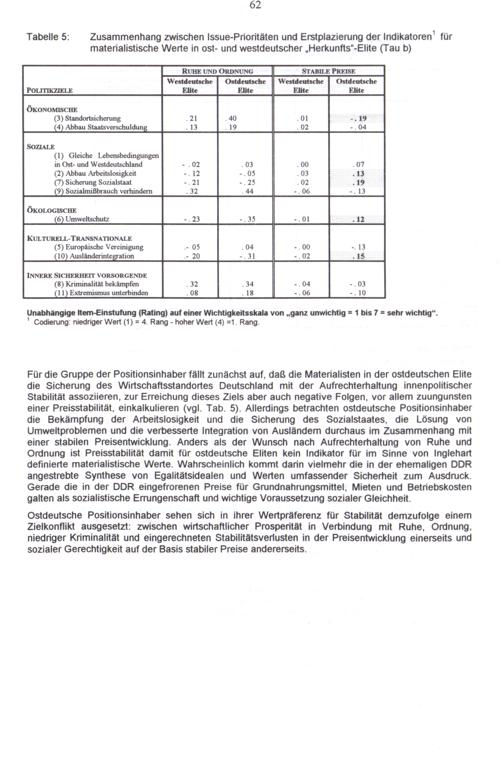 Tabelle 5: Zusammenhang zwischen Issue-Prioritäten und Erstplazierung der Indikatoren‘ für materialistische Werte in ost- und westdeutscher„Herkunfts“-Elite(Tau b)