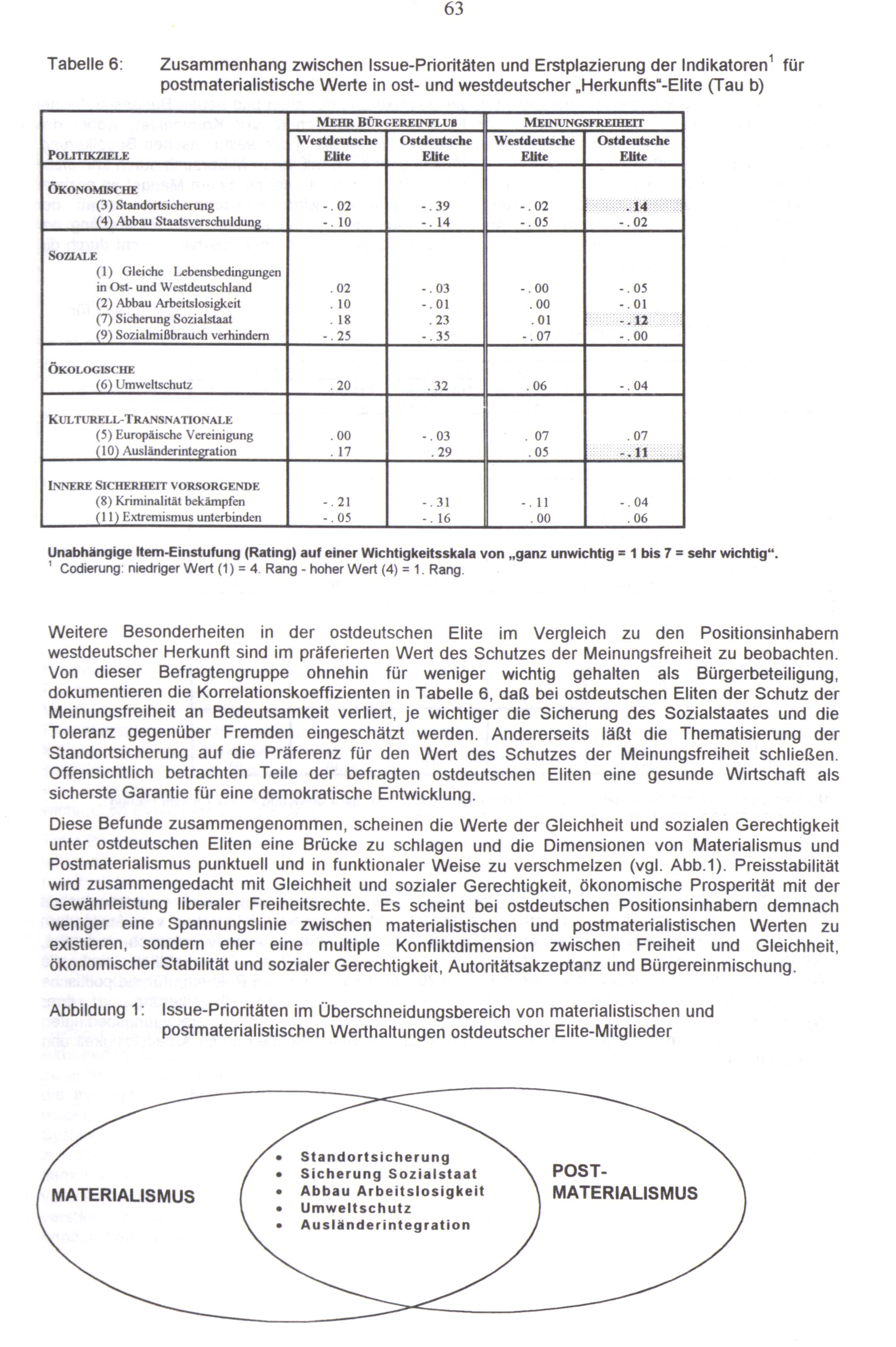 Tabelle 6: Zusammenhang zwischen Issue-Prioritäten und Erstplazierung der Indikatoren‘ für postmaterialistische Werte in ost- und westdeutscher„Herkunfts“-Elite(Tau b)