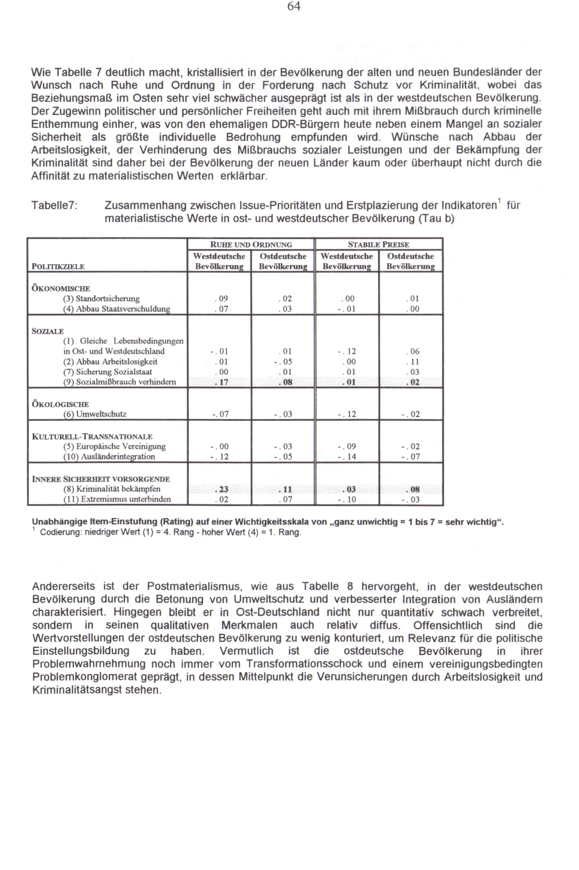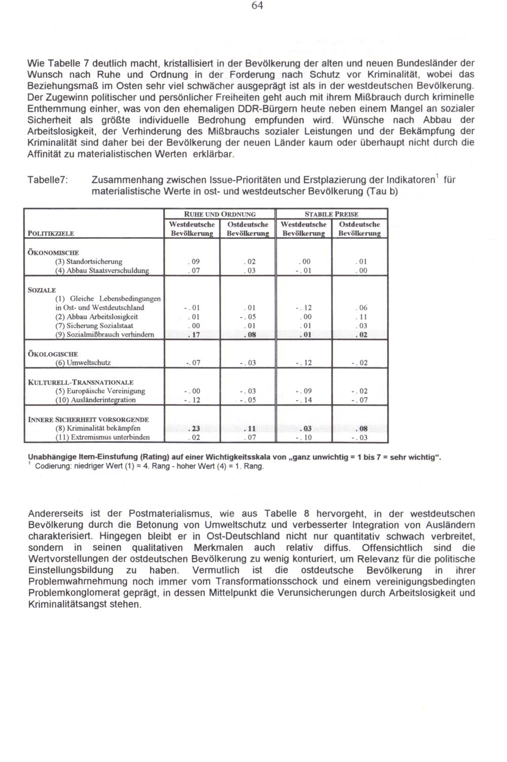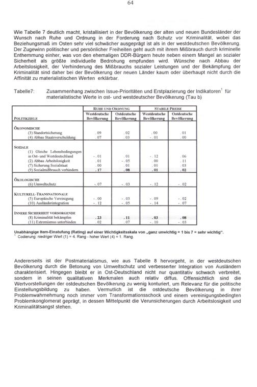Wie Tabelle 7 deutlich macht, kristallisiert in der Bevölkerung der alten und neuen Bundesländer der Wunsch nach Ruhe und Ordnung in der Forderung nach Schutz vor Kriminalität, wobei das Beziehungsmaß im Osten sehr viel schwächer ausgeprägt ist als in der westdeutschen Bevölkerung. Der Zugewinn politischer und persönlicher Freiheiten geht auch mit ihrem Mißbrauch durch kriminelle Enthemmung einher, was von den ehemaligen DDR-Bürgern heute neben einem Mangel an sozialer Sicherheit als größte individuelle Bedrohung empfunden wird. Wünsche nach Abbau der Arbeitslosigkeit, der Verhinderung des Mißbrauchs sozialer Leistungen und der Bekämpfung der Kriminalität sind daher bei der Bevölkerung der neuen Länder kaum oder überhaupt nicht durch die Affinität zu materialistischen Werten erklärbar.