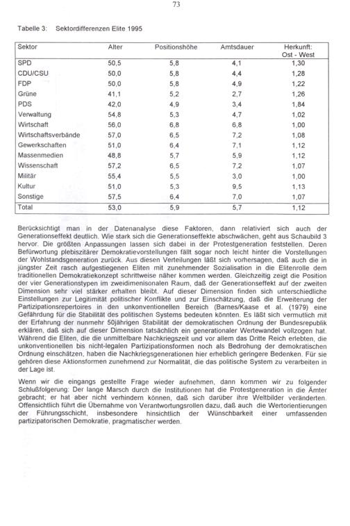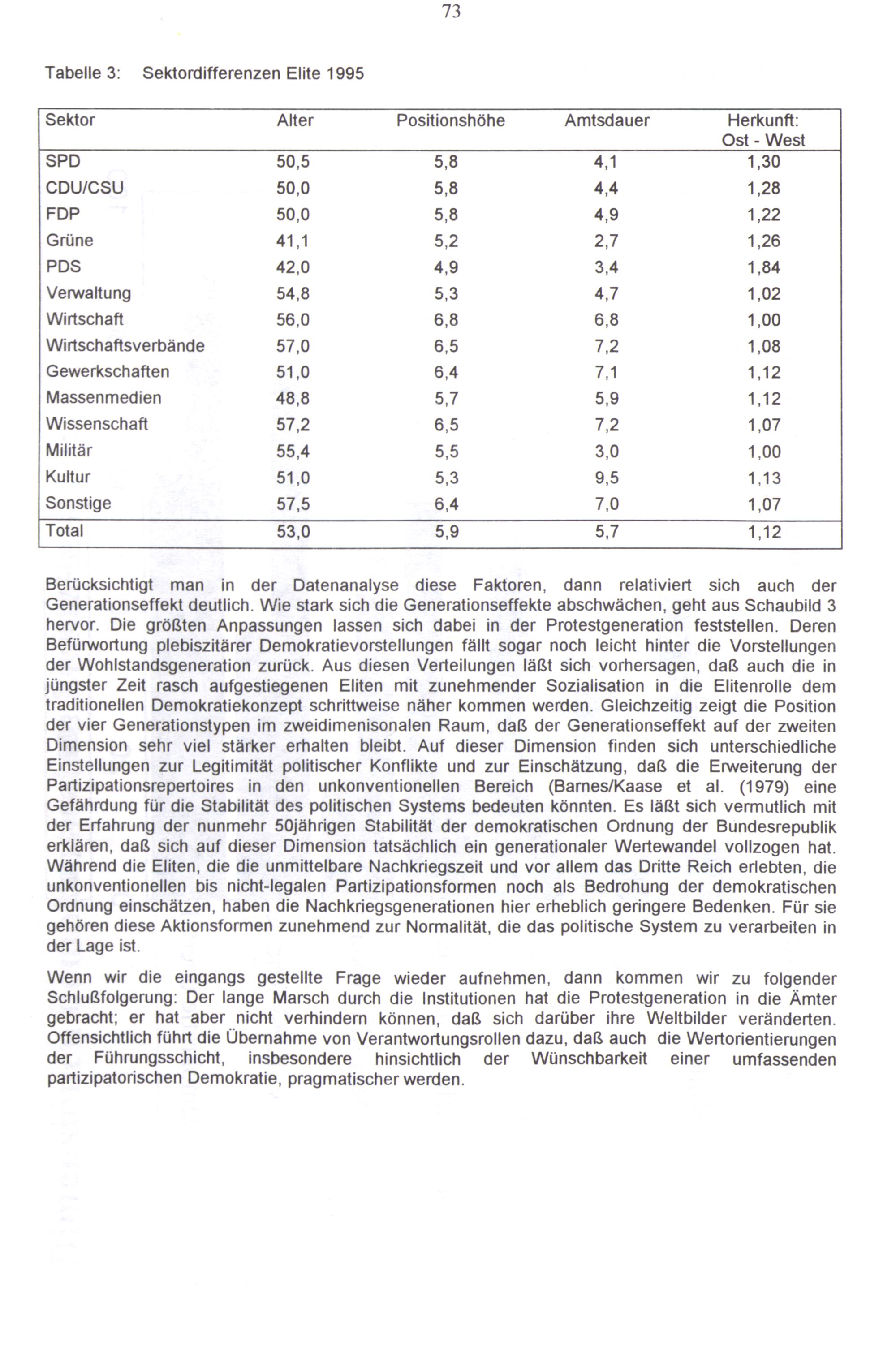 Wenn wir die eingangs gestellte Frage wieder aufnehmen, dann kommen wir zu folgender Schlußfolgerung: Der lange Marsch durch die Institutionen hat die Protestgeneration in die Ämter gebracht; er hat aber nicht verhindern können, daß sich darüber ihre Weltbilder veränderten. Offensichtlich führt die Übernahme von Verantwortungsrollen dazu, daß auch die Wertorientierungen der Führungsschicht, insbesondere hinsichtlich der Wünschbarkeit einer umfassenden partizipatorischen Demokratie, pragmatischer werden.