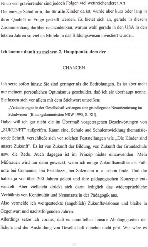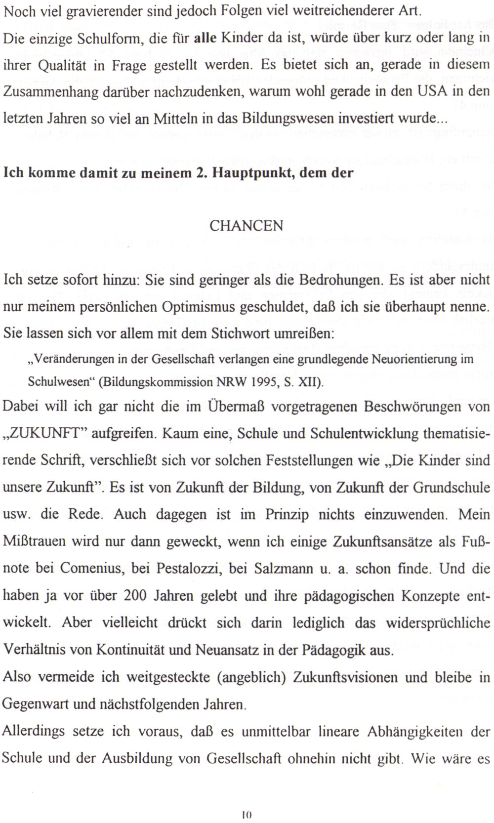 Ich setze sofort hinzu: Sie sind geringer als die Bedrohungen. Es ist aber nicht nur meinem persönlichen Optimismus geschuldet, daß ich sie überhaupt nenne. Sie lassen sich vor allem mit dem Stichwort umreißen: „Veränderungen in der Gesellschaft verlangen eine grundlegende Neuorientierung im Schulwesen“(Bildungskommission NRW 1995, S. XII). Dabei will ich gar nicht die im Übermaß vorgetragenen Beschwörungen von „ZUKUNFT” aufgreifen. Kaum eine, Schule und Schulentwicklung thematisierende Schrift, verschließt sich vor solchen Feststellungen wie„Die Kinder sind unsere Zukunft”. Es ist von Zukunft der Bildung, von Zukunft der Grundschule usw. die Rede. Auch dagegen ist im Prinzip nichts einzuwenden. Mein Mißtrauen wird nur dann geweckt, wenn ich einige Zukunftsansätze als Fußnote bei Comenius, bei Pestalozzi, bei Salzmann u. a. schon finde. Und die haben ja vor über 200 Jahren gelebt und ihre pädagogischen Konzepte entwickelt. Aber vielleicht drückt sich darin lediglich das widersprüchliche Verhältnis von Kontinuität und Neuansatz in der Pädagogik aus. Also vermeide ich weitgesteckte(angeblich) Zukunftsvisionen und bleibe in Gegenwart und nächstfolgenden Jahren. Allerdings setze ich voraus, daß es unmittelbar lineare Abhängigkeiten der