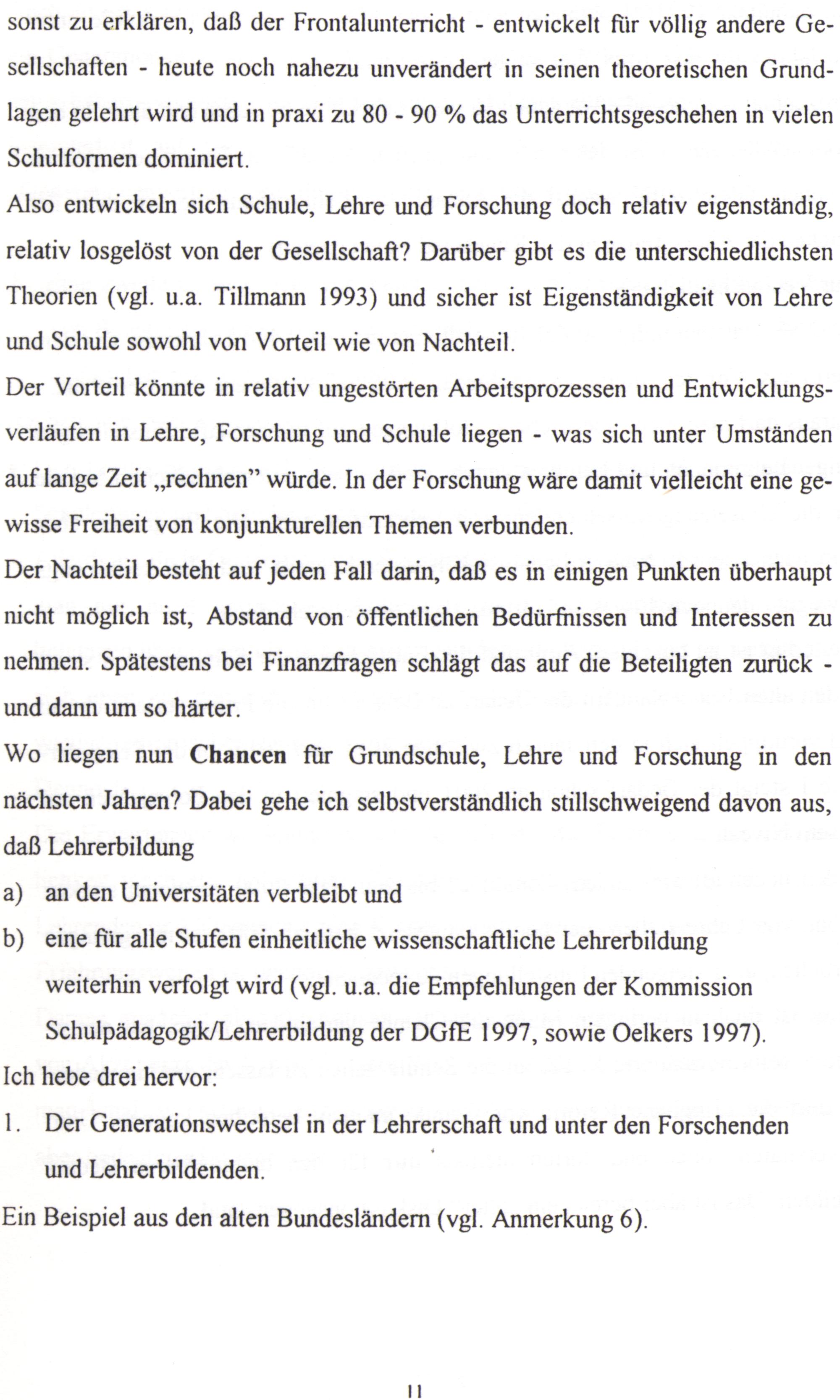 sonst zu erklären, daß der Frontalunterricht- entwickelt für völlig andere Gesellschaften- heute noch nahezu unverändert in seinen theoretischen Grundlagen gelehrt wird und in praxi zu 80- 90% das Unterrichtsgeschehen in vielen Schulformen dominiert. Also entwickeln sich Schule, Lehre und Forschung doch relativ eigenständig, relativ losgelöst von der Gesellschaft? Darüber gibt es die unterschiedlichsten Theorien(vgl. u.a. Tillmann 1993) und sicher ist Eigenständigkeit von Lehre und Schule sowohl von Vorteil wie von Nachteil. Der Vorteil könnte in relativ ungestörten Arbeitsprozessen und Entwicklungsverläufen in Lehre, Forschung und Schule liegen- was sich unter Umständen auf lange Zeit„rechnen”” würde. In der Forschung wäre damit vielleicht eine gewisse Freiheit von konjunkturellen Themen verbunden. Der Nachteil besteht auf jeden Fall darin, daß es in einigen Punkten überhaupt nicht möglich ist, Abstand von öffentlichen Bedürfnissen und Interessen zu nehmen. Spätestens bei Finanzfragen schlägt das auf die Beteiligten zurück und dann um so härter. Wo liegen nun Chancen für Grundschule, Lehre und Forschung in den nächsten Jahren? Dabei gehe ich selbstverständlich stillschweigend davon aus, daß Lehrerbildung a) an den Universitäten verbleibt und b) eine für alle Stufen einheitliche wissenschaftliche Lehrerbildung weiterhin verfolgt wird(vgl. u.a. die Empfehlungen der Kommission Schulpädagogik/Lehrerbildung der DGfE 1997, sowie Oelkers 1997). Ich hebe drei hervor: 1. Der Generationswechsel in der Lehrerschaft und unter den Forschenden und Lehrerbildenden.| Eın Beispiel aus den alten Bundesländern(vgl. Anmerkung 6).