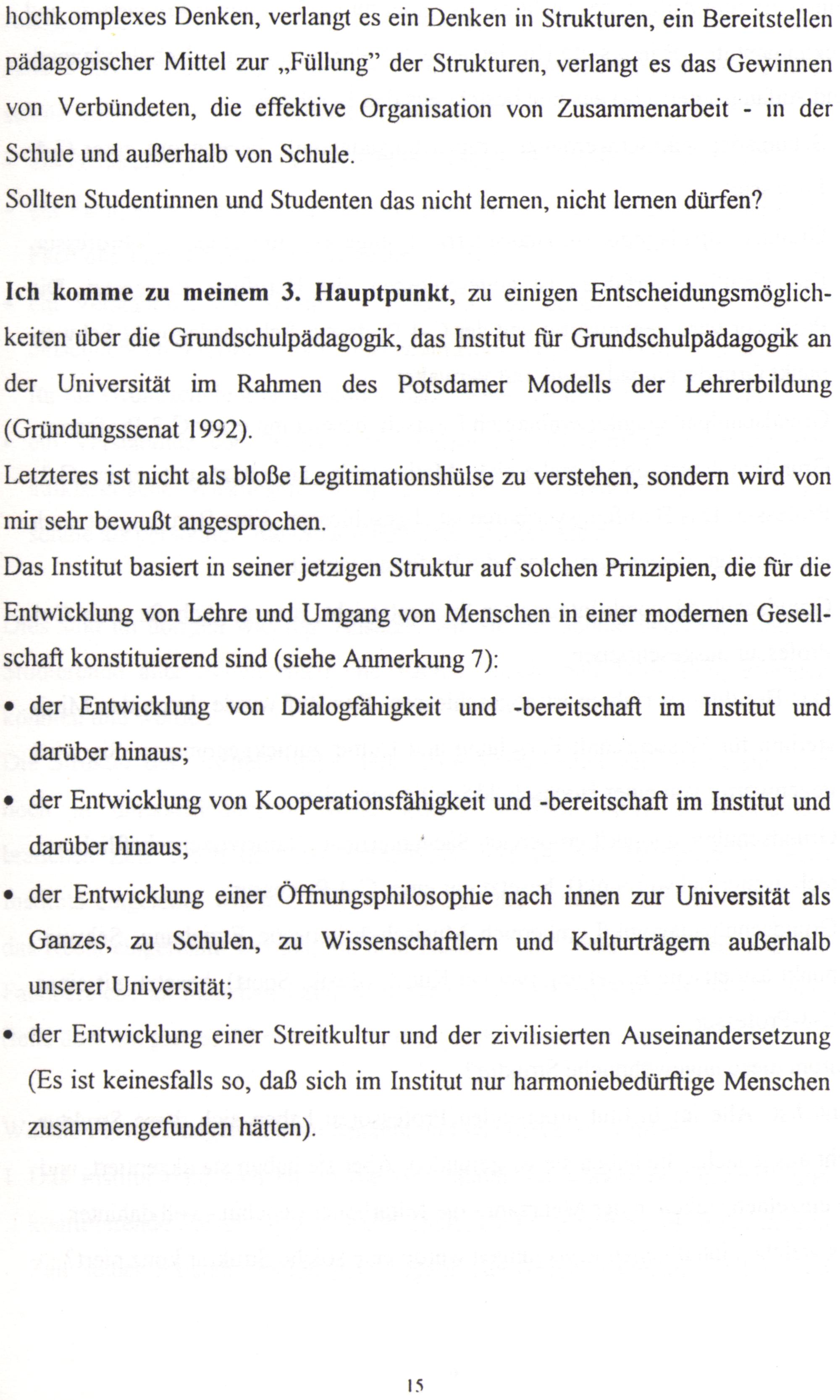 Ich komme zu meinem 3. Hauptpunkt, zu einigen Entscheidungsmöglichkeiten über die Grundschulpädagogik, das Institut für Grundschulpädagogik an der Universität im Rahmen des Potsdamer Modells der Lehrerbildung (Gründungssenat 1992).