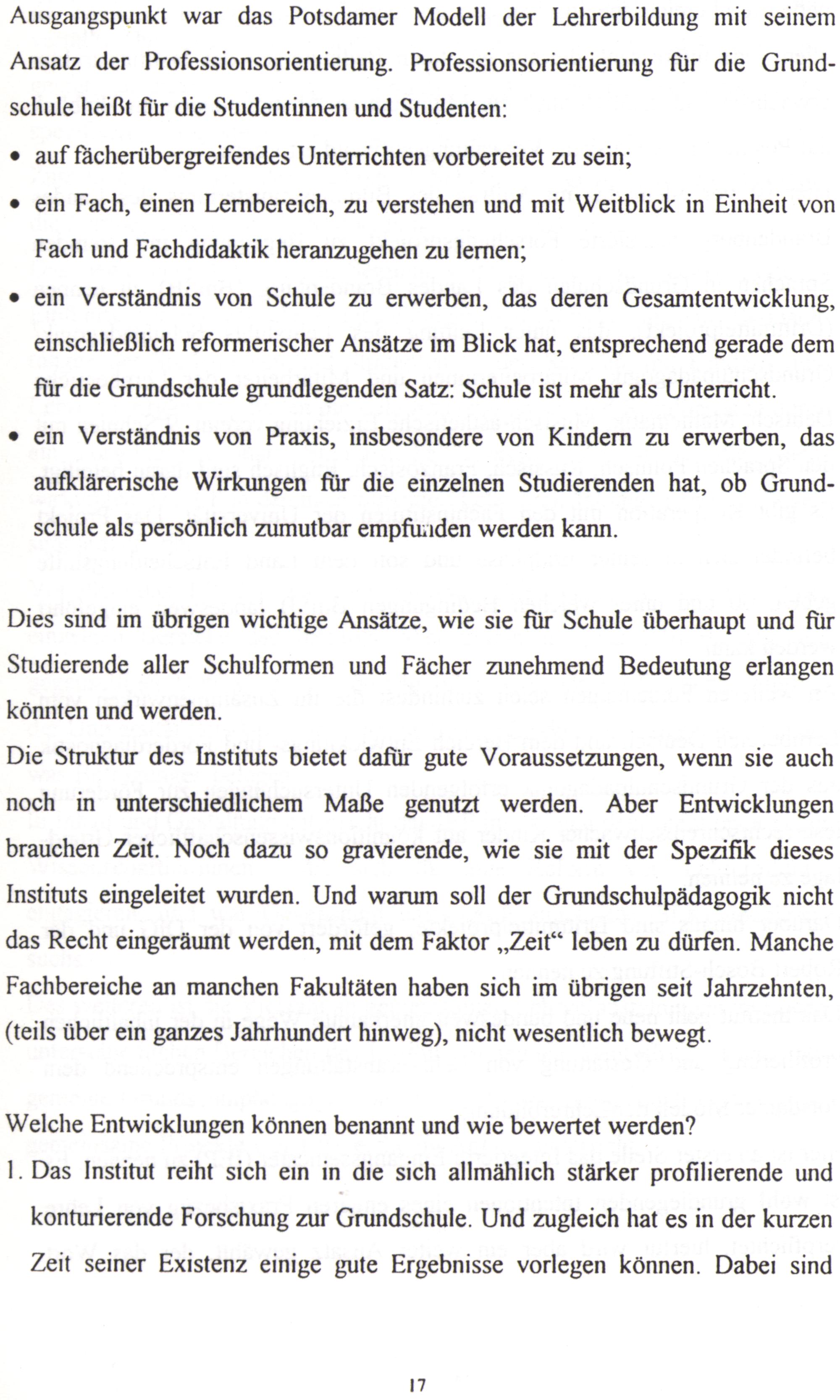 Die Struktur des Instituts bietet dafür gute Voraussetzungen, wenn sie auch noch in unterschiedlichem Maße genutzt werden. Aber Entwicklungen brauchen Zeit. Noch dazu so gravierende, wie sie mit der Spezifik dieses Instituts eingeleitet wurden. Und warum soll der Grundschulpädagogik nicht das Recht eingeräumt werden, mit dem Faktor„Zeit“ leben zu dürfen. Manche Fachbereiche an manchen Fakultäten haben sich im übrigen seit Jahrzehnten,