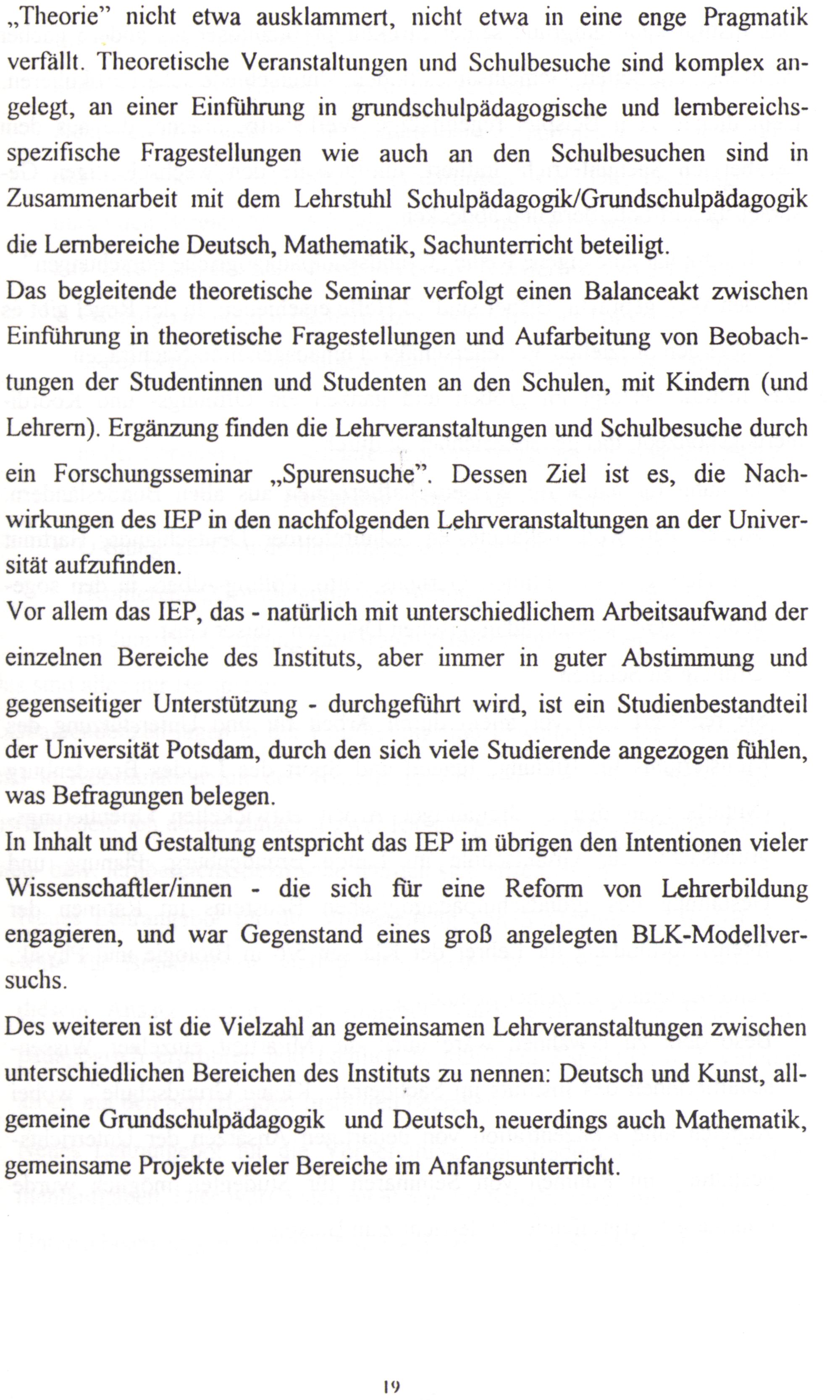 In Inhalt und Gestaltung entspricht das IEP im übrigen den Intentionen vieler Wissenschaftler/innen- die sich für eine Reform von Lehrerbildung engagieren, und war Gegenstand eines groß angelegten BLK-Modellversuchs.
