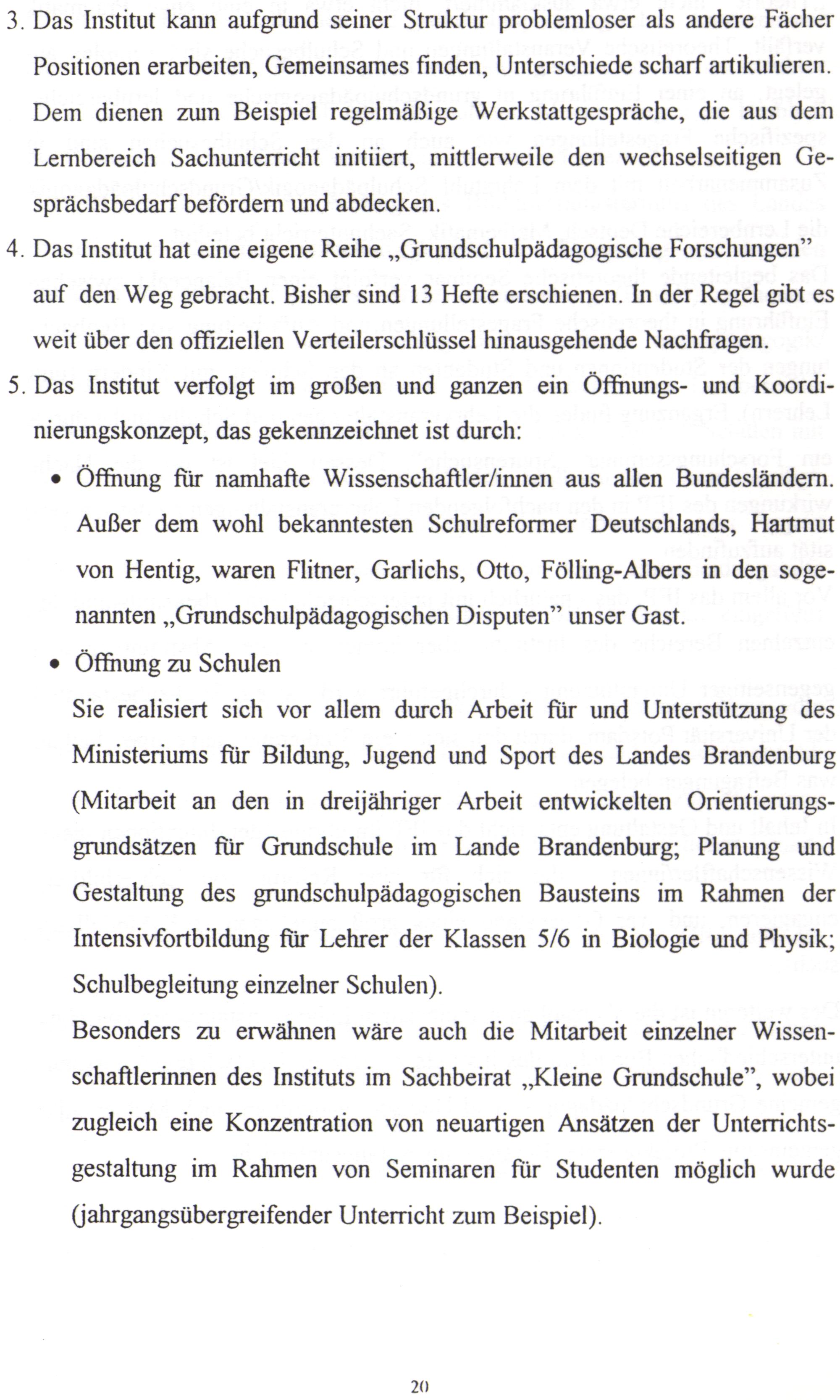 3. Das Institut kann aufgrund seiner Struktur problemloser als andere Fächer Positionen erarbeiten, Gemeinsames finden, Unterschiede scharf artiıkulieren. Dem dienen zum Beispiel regelmäßige Werkstattgespräche, die aus dem Lernbereich Sachunterricht initiiert, mittlerweile den wechselseitigen Gesprächsbedarf befördern und abdecken.