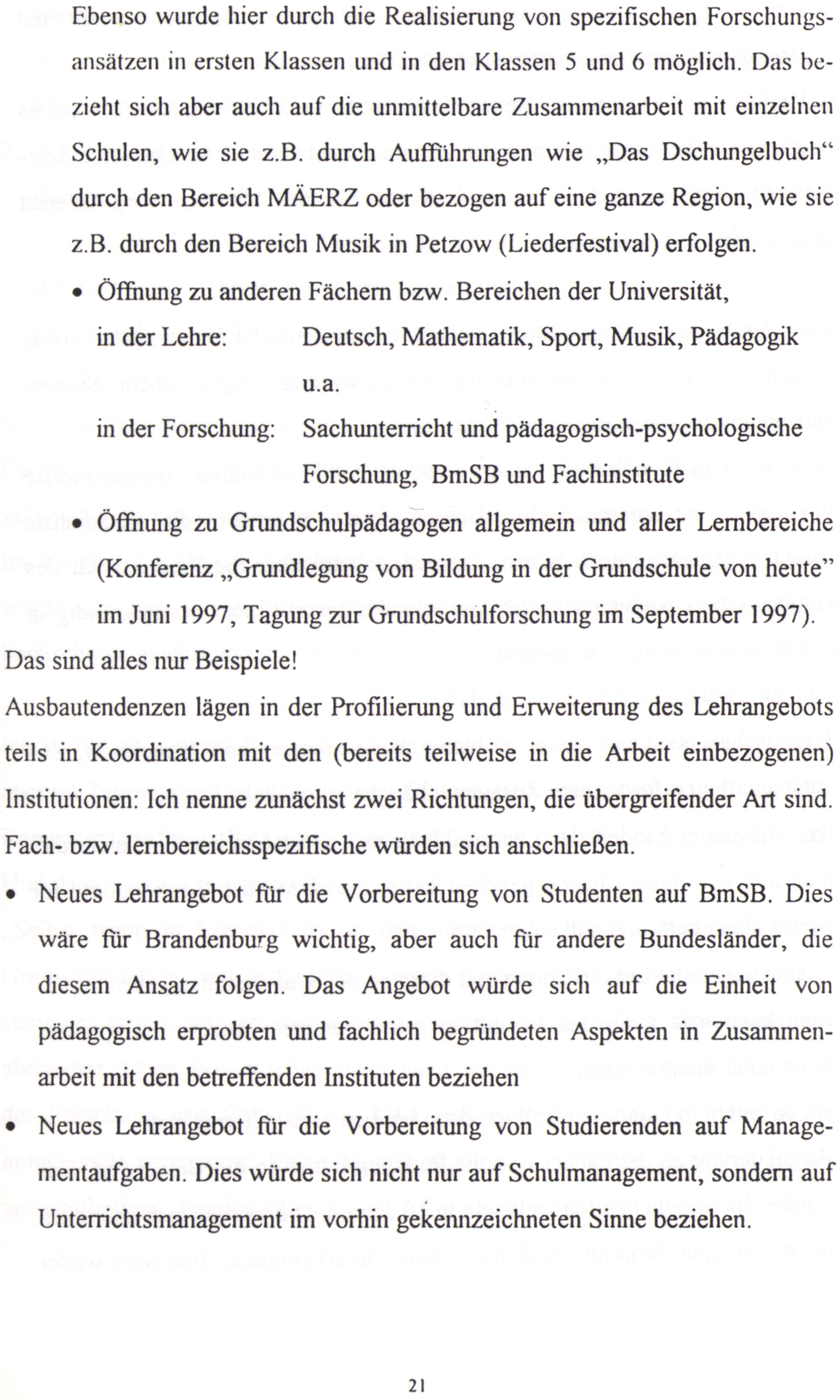 Ebenso wurde hier durch die Realisierung von spezifischen Forschungsansätzen ın ersten Klassen und ın den Klassen 5 und 6 möglich. Das bezieht sich aber auch auf die unmittelbare Zusammenarbeit mit einzelnen Schulen, wie sie z.B. durch Aufführungen wie„Das Dschungelbuch“ durch den Bereich MÄERZ oder bezogen auf eine ganze Region, wie sie z.B. durch den Bereich Musik in Petzow(Liederfestival) erfolgen. e Öffnung zu anderen Fächern bzw. Bereichen der Universität, in der Lehre: Deutsch, Mathematik, Sport, Musik, Pädagogik u.a. in der Forschung: Sachunterricht und pädagogisch-psychologische Forschung, BmSB und Fachinstitute e Öffnung zu Grundschulpädagogen allgemein und aller Lernbereiche (Konferenz„Grundlegung von Bildung in der Grundschule von heute” im Juni 1997, Tagung zur Grundschulforschung im September 1997).