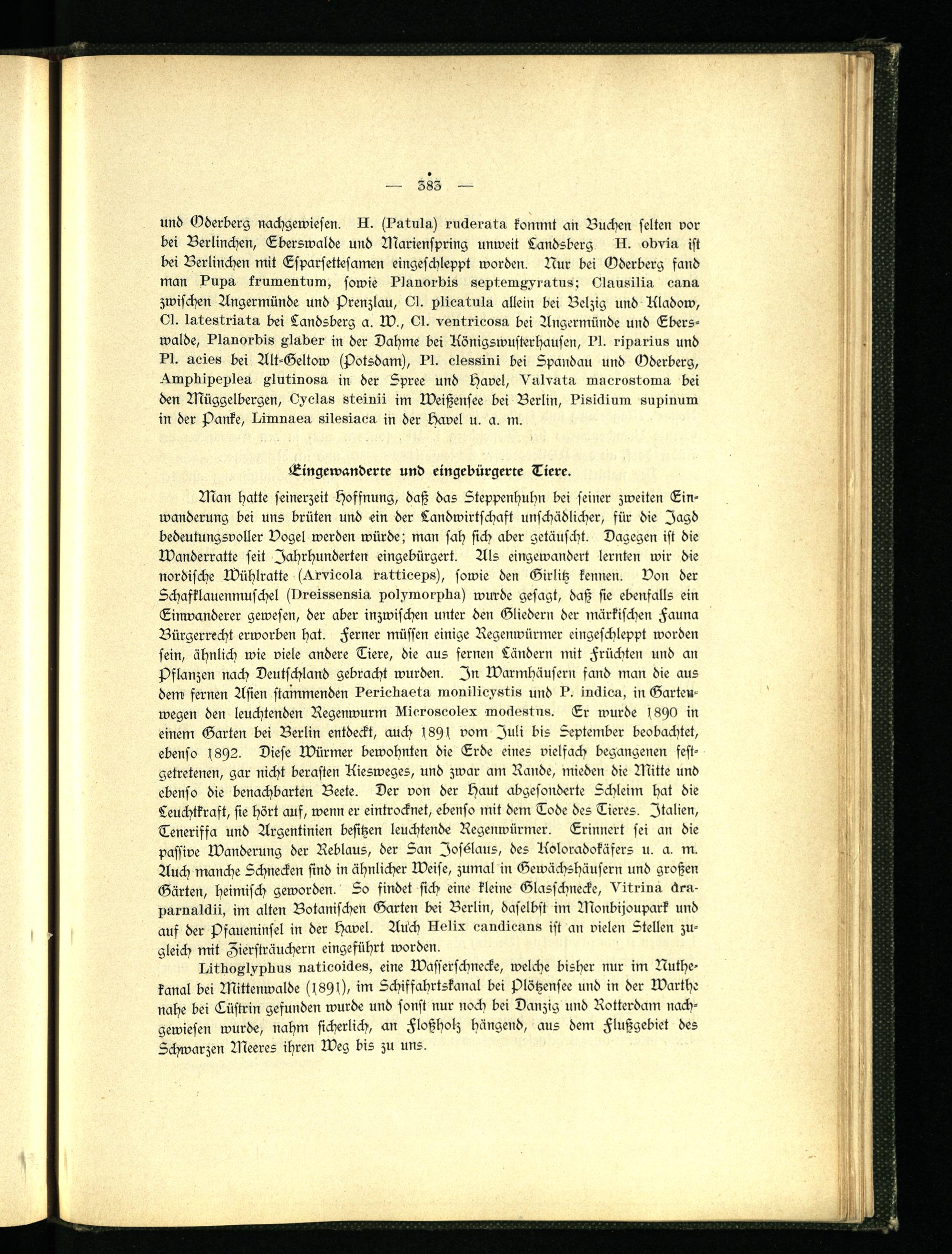 Wan hatte seinerzeit Hoffnung, daß das Steppenhuhn bei seiner zweiten Einwanderung bei uns brüten und ein der Landwirtschaft unschädlicher, für die Jagd bedeutungsvoller Vogel werden würde; man sah sich aber getäuscht. Dagegen ist die Wanderratte seit Jahrhunderten eingebürgert. Als eingewandert lernten wir die nordische Wühlratte sckrvieolu. rnttieeps), sowie den Girlitz kennen. Von der Schafklauenmuschel (vreissensig. pochmorplin) wurde gesagt, daß sie ebenfalls ein Einwanderer gewesen, der aber inzwischen unter den Gliedern der märkischen Fauna Bürgerrecht erworben hat. Ferner müssen einige Regenwürmer eingeschleppt worden sein, ähnlich wie viele andere Tiere, die aus fernen Ländern mit Früchten und an Pflanzen nach Deutschland gebracht wurden. In Warmhäusern fand man die aus dem fernen Asien stammenden Deriobuetu mouiliopstis und D. Indien, in Gartenwegen den leuchtenden Regenwurm Nieroseolex modesln«. Ex wurde s8stO in einem Garten bei Berlin entdeckt, auch 1891 vom Juli bis September beobachtet, ebenso s892. Diese Würmer bewohnten die Erde eines vielfach begangenen festgetretenen, gar nicht berasten Kiesweges, und zwar am Rande, mieden die Nkitte und ebenso die benachbarten Beete. Der von der Haut abgesonderte Schleim hat die Leuchtkraft, sie hört auf, wenn er eintrocknet, ebenso mit dem Tode des Tieres. Italien, Teneriffa und Argentinien besitzen leuchtende Regenwürmer. Erinnert sei an die passive Wanderung der Reblaus, der San Iosölaus, des Koloradokäfers u. a. m. Auch manche Schnecken sind in ähnlicher Weise, zumal in Gewächshäusern und großen Gärten, heimisch geworden. So findet sich eine kleine Glasfchnecke, Vitrlnu drn- parualckü, im alten Botanischen Garten bei Berlin, daselbst im Wonbijoupark und auf der Pfaueninsel in der Havel. Auch Helix eandicuim ist an vielen Stellen zugleich mit Ziersträuchern eingeführt worden.
