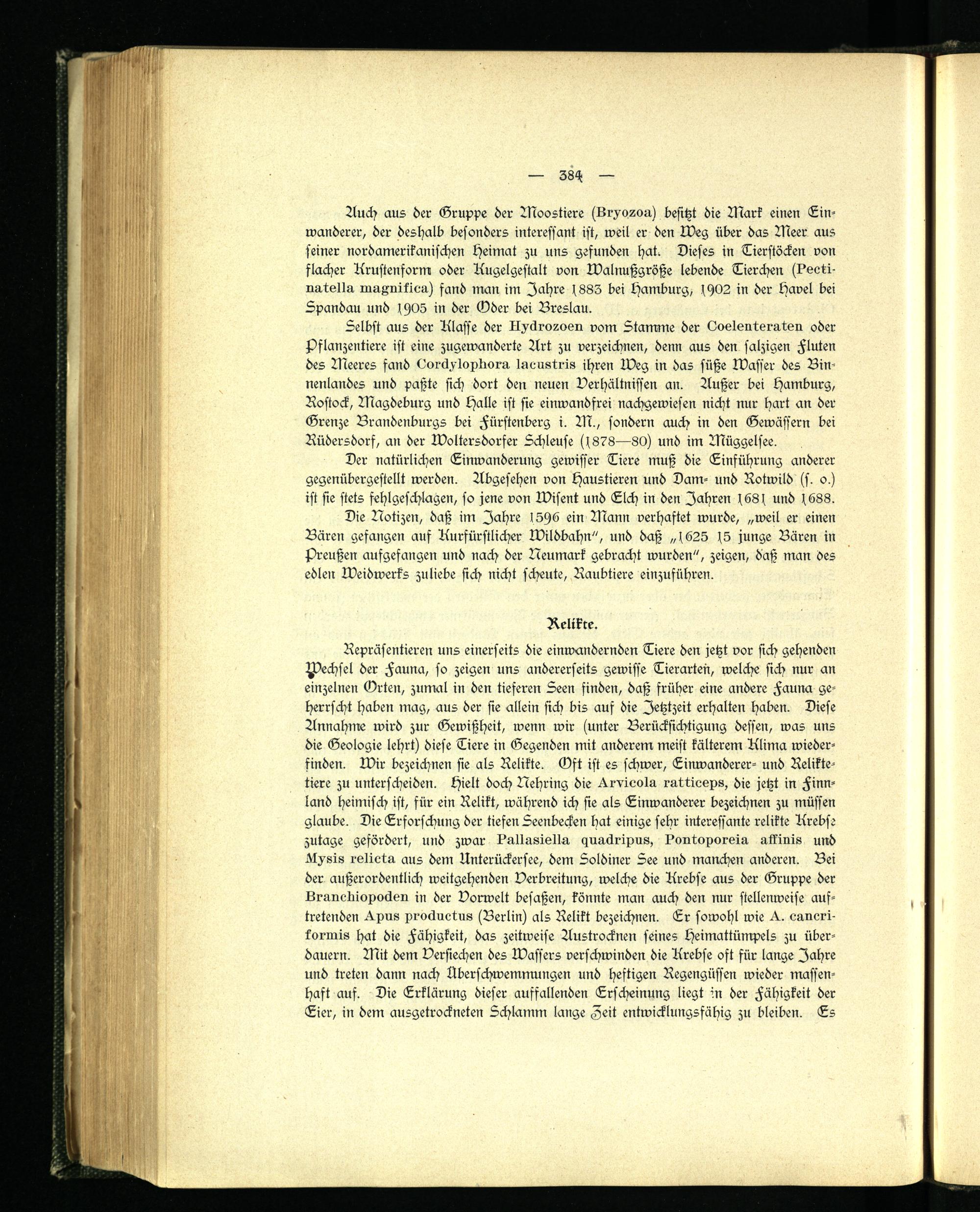 Repräsentieren uns einerseits die einwandernden Tiere den jetzt vor sich gehenden Wechsel der Fauna, so zeigen uns andererseits gewisse Tierarten, welche sich nur an einzelnen Grten, zumal in den tieferen Seen finden, daß früher eine andere Fauna geherrscht haben mag, aus der sie allein sich bis auf die Jetztzeit erhalten haben. Diese Annahme wird zur Gewißheit, wenn wir (unter Berücksichtigung dessen, was uns die Geologie lehrt) diese Tiere in Gegenden mit anderem meist kälterem Klima wiederfinden. Wir bezeichnen sie als Relikte. Gft ist es schwer, Ginwanderer- und Reliktetiere zu unterscheiden, hielt doch Nehring die ^rvieola ruttieops, die jetzt in Finnland heimisch ist, für ein Relikt, während ich sie als Ginwanderer bezeichnen zu müssen glaube. Die Grforschung der tiefen Seenbecken hat einige sehr interessante relikte Krebse zutage gefördert, und zwar kallnsiellg. luaäripns, I'ontoporoin atkinis und rslieta aus dem Knterückersee, dem Soldiner 5ee und manchen anderen. Bei der außerordentlich weitgehenden Verbreitung, welche die Krebse aus der Gruppe der Lranebiopoäen in der Vorwelt besaßen, könnte man auch den nur stellenweise auftretenden ^.xn8 xi-orluetns (Berlin) als Relikt bezeichnen. Gr sowohl wie eaneri- kormis hat die Fähigkeit, das zeitweise Austrocknen seines Heimattümpels zu überdauern. Mit dem Versiechen des Wassers verschwinden die Krebse oft für lange Jahre und treten dann nach Überschwemmungen und heftigen Regengüssen wieder massenhaft auf. Die Grklärung dieser auffallenden Erscheinung liegt in der Fähigkeit der Gier, in dem ausgetrockneten Schlamm lange Zeit entwicklungsfähig zu bleiben. Gs