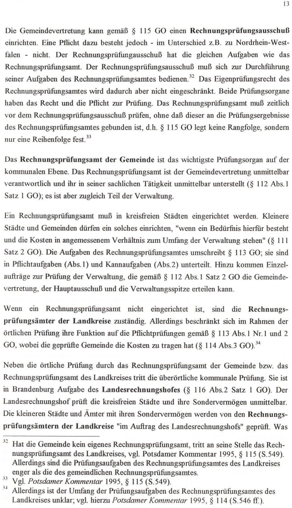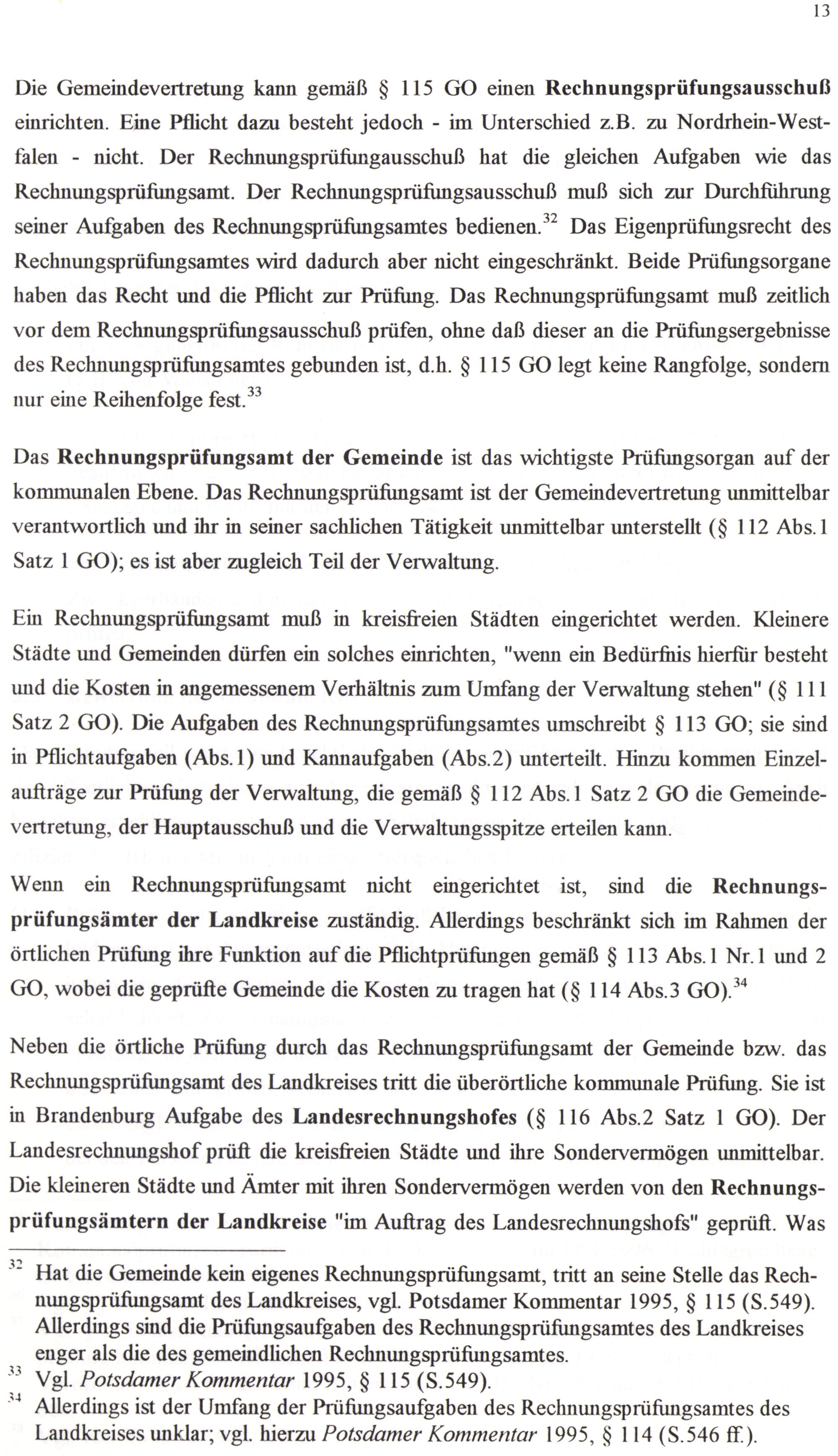 Hat die Gemeinde kein eigenes Rechnungsprüfungsamt, tritt an seine Stelle das Rechnungsprüfungsamt des Landkreises, vgl. Potsdamer Kommentar 1995, 8 115(S.549). Allerdings sind die Prüfungsaufgaben des Rechnungsprüfungsamtes des Landkreises enger als die des gemeindlichen Rechnungsprüfungsamtes.