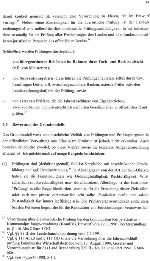 Verordnung über die überörtliche Prüfung bei den kommunalen Körperschaften Kommunalprüfungsverordnung(KomPV), Entwurf vom 12.1.1996. Rechtsgrundlage ist$ 116 Abs.2 Satz 5 GO. © Vgl. 88 88 ff. der Landeshaushaltsordnung vom 7.5.1991. ” Vgl. 8 117 Abs.3 und 8 118 GO sowie die Verordnung über die Jahresabschlußprüfung kommunaler Wirtschaftsbetriebe vom 13. August 1996, Gesetz- und Verordnungsblatt für das Land Brandenburg Teil II- Nr. 33 vom 19.9.1996, S.680686. Vgl. von Wysocki 1988, S.1£.