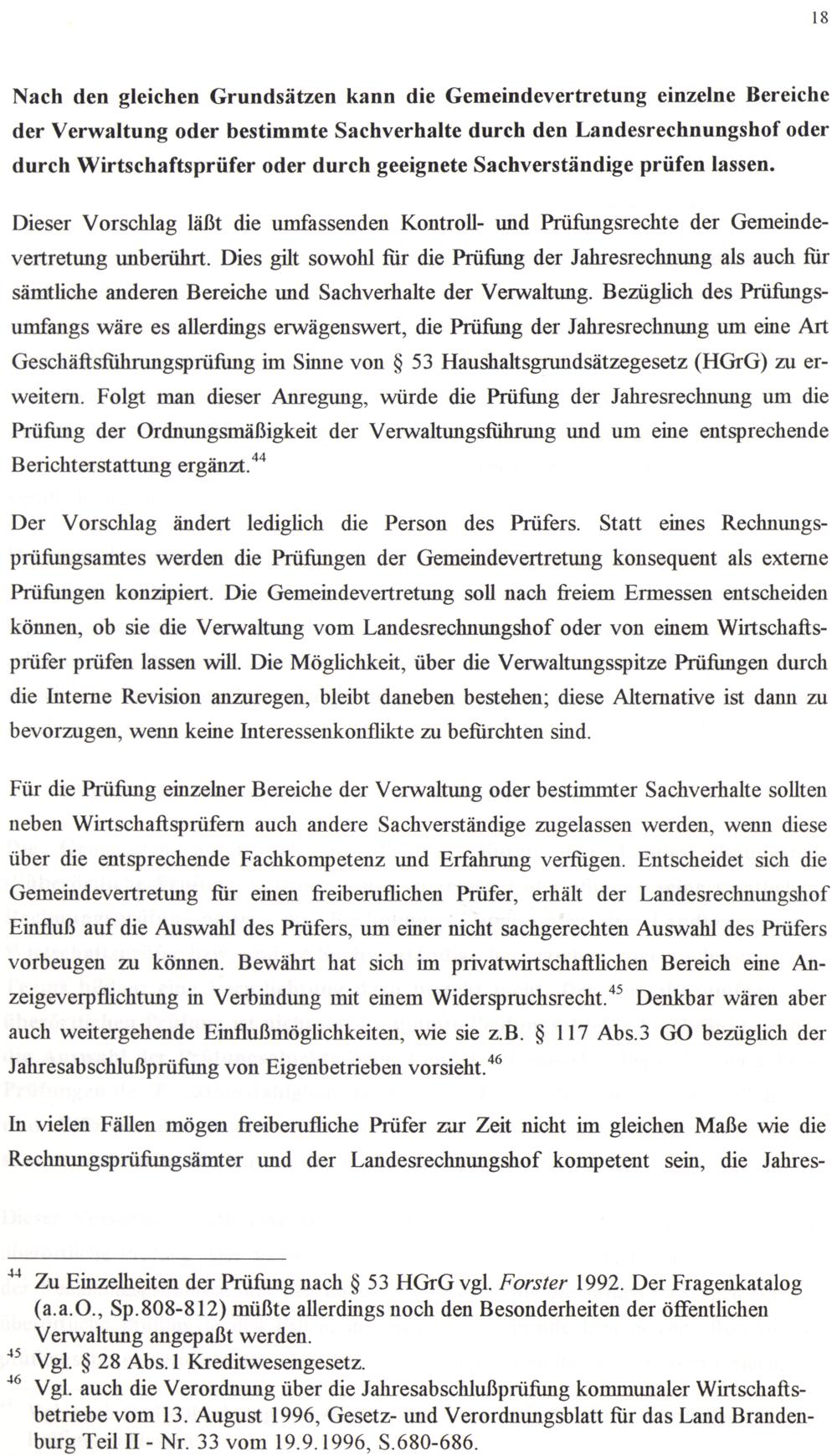 Dieser Vorschlag läßt die umfassenden Kontroll- und Prüfungsrechte der Gemeindevertretung unberührt. Dies gilt sowohl für die Prüfung der Jahresrechnung als auch für sämtliche anderen Bereiche und Sachverhalte der Verwaltung. Bezüglich des Prüfungsumfangs wäre es allerdings erwägenswert, die Prüfung der Jahresrechnung um eine Art Geschäftsführungsprüfung im Sinne von$ 53 Haushaltsgrundsätzegesetz(HGrG) zu erweitern. Folgt man dieser Anregung, würde die Prüfung der Jahresrechnung um die Prüfung der Ordnungsmäßigkeit der Verwaltungsführung und um eine entsprechende Berichterstattung ergänzt.“