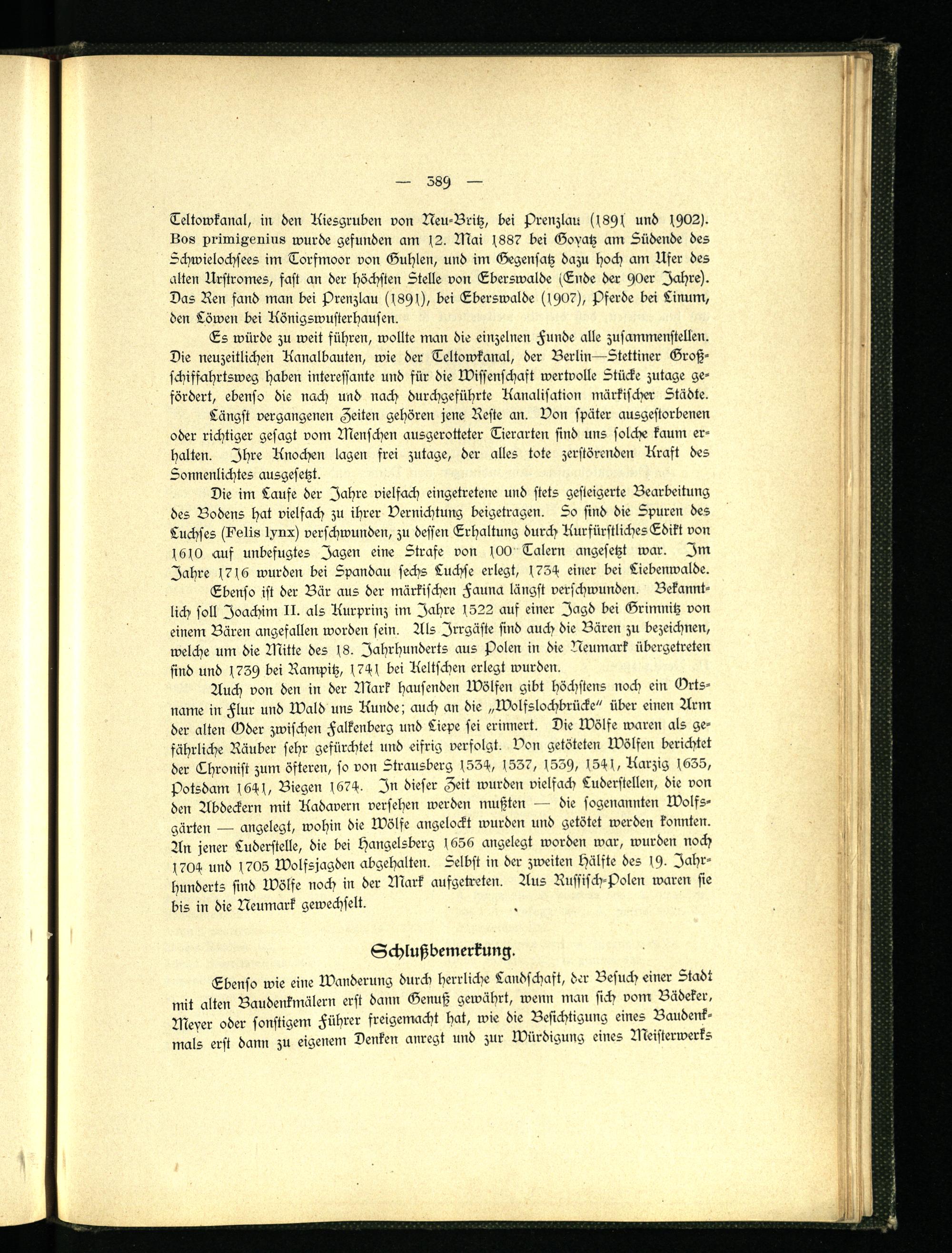 Die im Laufe der Jahre vielfach eingetretene und stets gesteigerte Bearbeitung des Bodens hat vielfach zu ihrer Vernichtung beigetragen. 5o sind die Spuren des Luchses sVolis lz'ux) verschwunden, zu dessen Erhaltung durch Kurfürstliches Edikt von 1610 auf unbefugtes Jagen eine Strafe von 100 Talern angesetzt war. Im Jahre 17)6 wurden bei Spandau sechs Luchse erlegt, 1734 einer bei Liebenwalde.