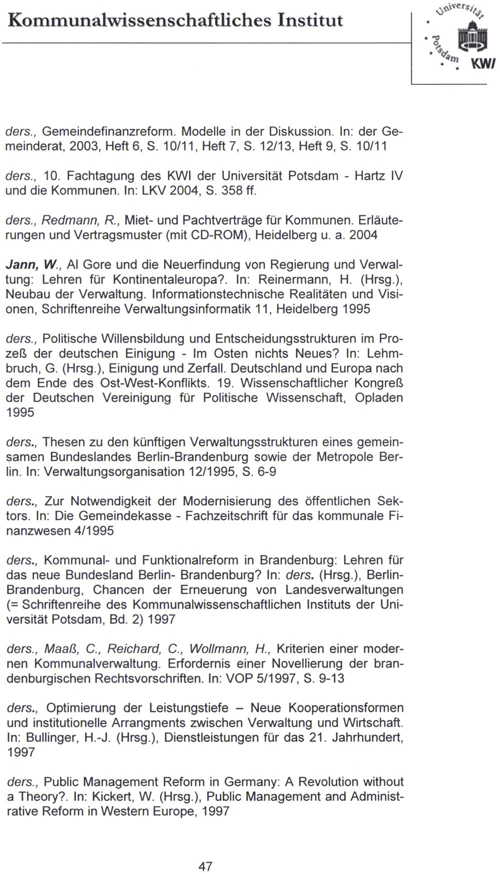 ders., Public Management Reform in Germany: A Revolution without a Theory?. In: Kickert, W.(Hrsg.), Public Management and Administrative Reform in Western Europe, 1997