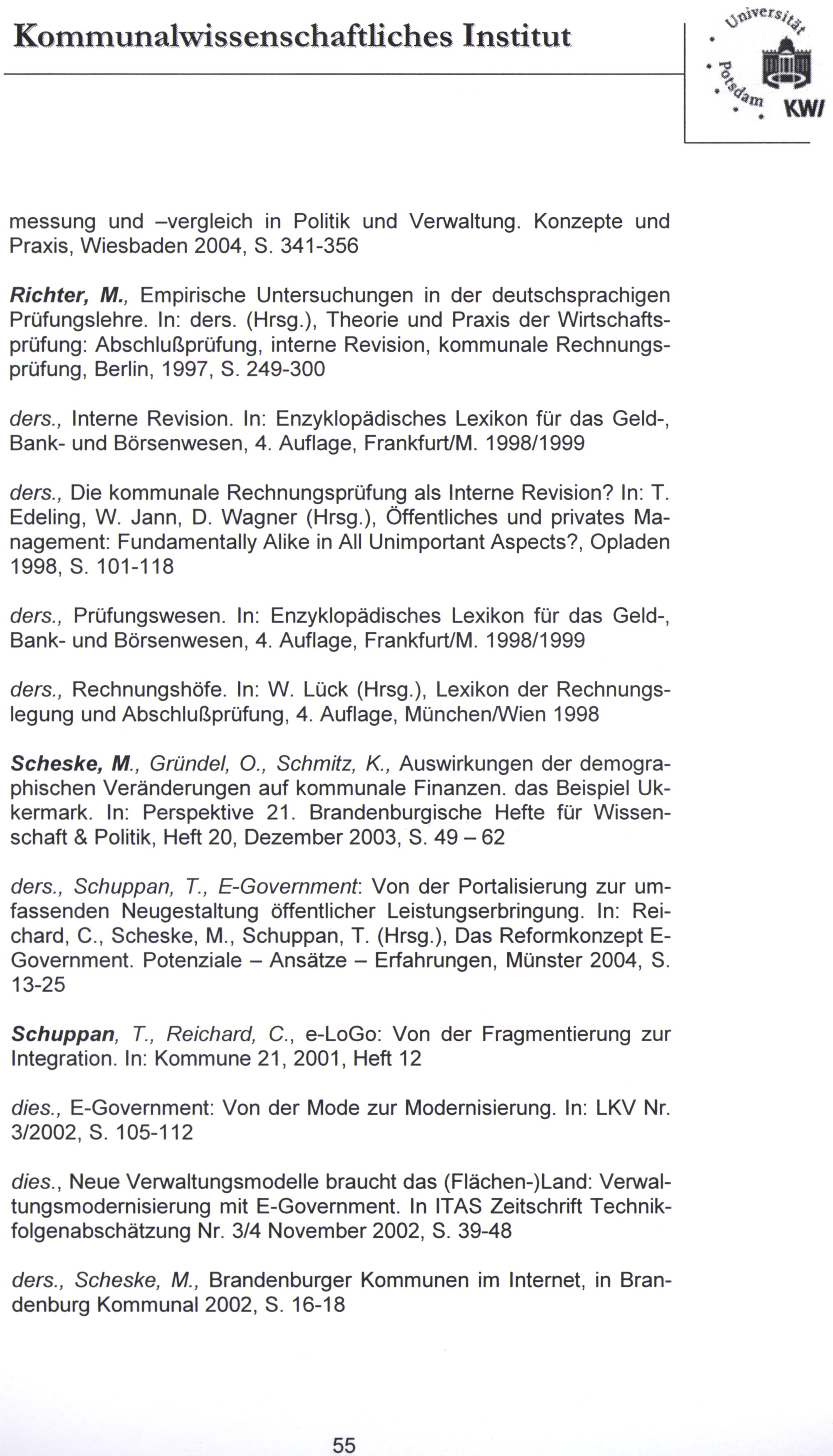 ders., Die kommunale Rechnungsprüfung als Interne Revision? In: T. Edeling, W. Jann, D. Wagner(Hrsg.), Öffentliches und privates Management: Fundamentally Alike in All Unimportant Aspects?, Opladen 1998, S. 101-118