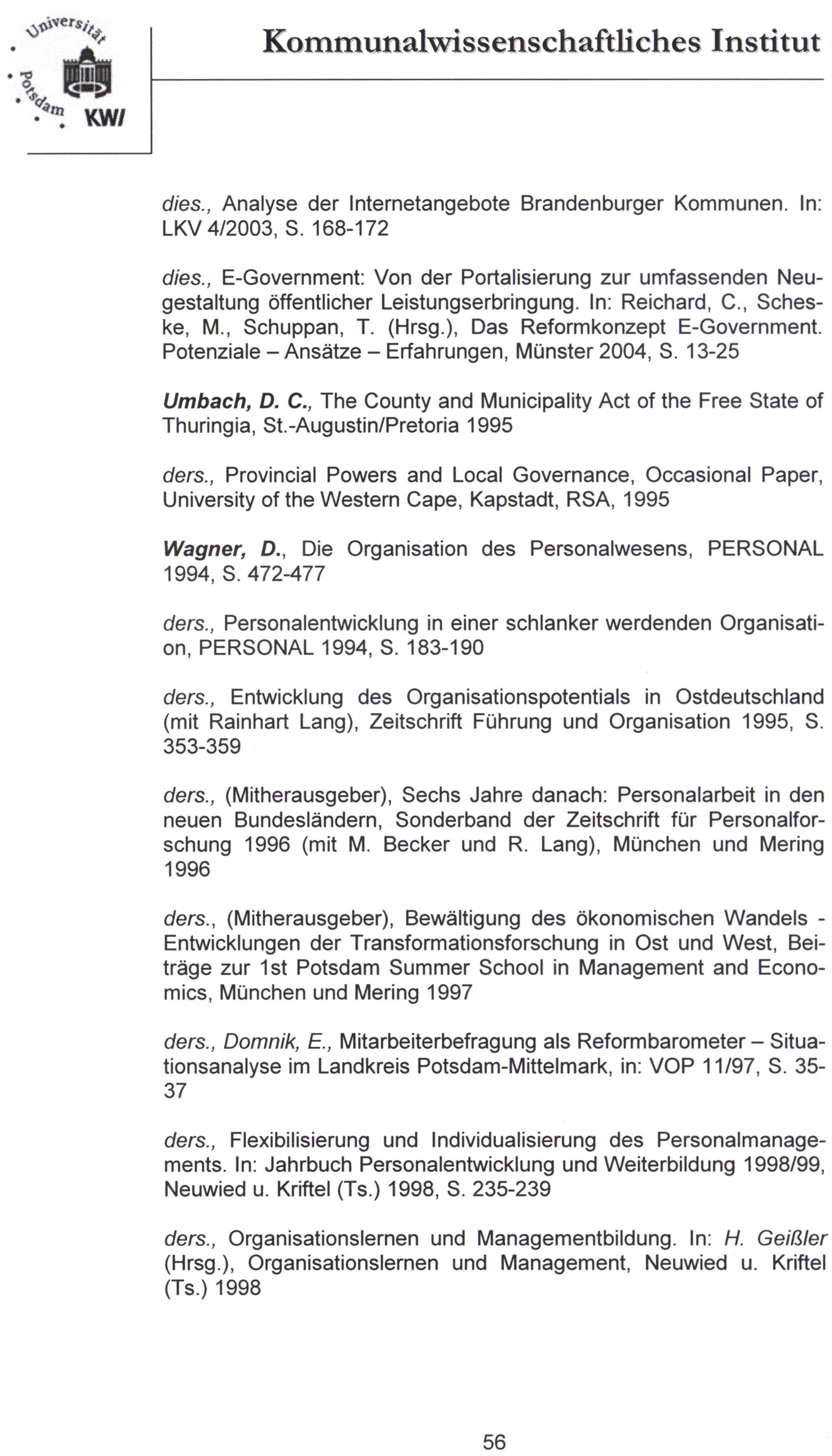 ders.,(Mitherausgeber), Sechs Jahre danach: Personalarbeit in den neuen Bundesländern, Sonderband der Zeitschrift für Personalforschung 1996(mit M. Becker und R. Lang), München und Mering 1996