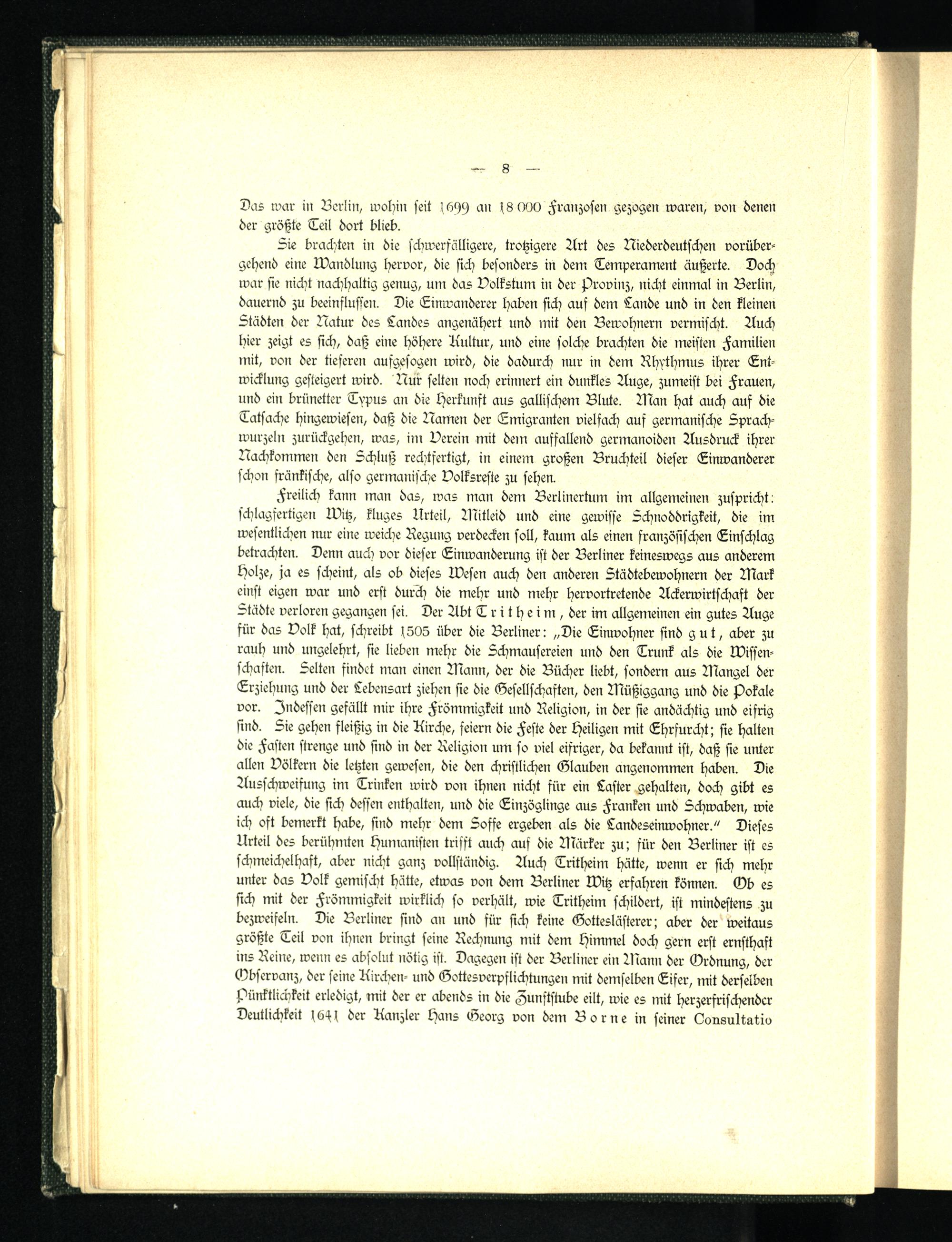 Freilich kann man das, was man dem Berlinertum im allgemeinen zuspricht: schlagfertigen Witz, kluges Urteil, Witleid und eine gewisse Schnoddrigkeit, die im wesentlichen nur eine weiche Regung verdecken soll, kaum als einen französischen Einschlag betrachten. Denn auch vor dieser Einwanderung ist der Berliner keineswegs aus anderem Holze, ja es scheint, als ob dieses Wesen auch den anderen Städtebewohnern der Wark einst eigen war und erst durch die mehr und mehr hervortretende Ackerwirtschaft der Städte verloren gegangen sei. Der Abt T r i t h e i m, der im allgemeinen ein gutes Auge für das Volk hat, schreibt l505 über die Berliner: „Die Einwohner sind gut, aber zu rauh und ungelehrt, sie lieben mehr die Schmausereien und den Trunk als die Wissenschaften. Selten findet man einen Wann, der die Bücher liebt, sondern aus Wangel der Erziehung und der Lebensart ziehen sie die Gesellschaften, den Wüßiggang und die Pokale vor. Indessen gefällt nur ihre Frömmigkeit und Religion, in der sie andächtig und eifrig sind. Sie gehen fleißig in die Airche, feiern die Feste der heiligen mit Ehrfurcht; sie halten die Fasten strenge und sind in der Religion um so viel eifriger, da bekannt ist, daß sie unter allen Völkern die letzten gewesen, die den christlichen Glauben angenommen haben. Die Ausschweifung im Trinken wird von ihnen nicht für ein Laster gehalten, doch gibt es auch viele, die sich dessen enthalten, und die Einzöglinge aus Franken und Schwaben, wie ich oft bemerkt habe, sind mehr dem Söffe ergeben als die Landeseinwohner." Dieses Urteil des berühmten Humanisten trifft auch auf die Wärter zu; für den Berliner ist es schmeichelhaft, aber nicht ganz vollständig. Auch Tritheim hätte, wenn er sich mehr unter das Volk gemischt hätte, etwas von dem Berliner Witz erfahren können. Ob es sich mit der Frömmigkeit wirklich so verhält, wie Tritheim schildert, ist mindestens zu bezweifeln. Die Berliner sind an lind für sich keine Gotteslästerer; aber der weitaus größte Teil von ihnen bringt seine Rechnung mit dem Himmel doch gern erst ernsthaft im Reine, wenn es absolut nötig ist. Dagegen ist der Berliner ein Wann der Ordnung, der Observanz, der seine Airchen- und Gottesverpflichtungen mit demselben Eifer, mit derselben Pünktlichkeit erledigt, mit der er abends in die Zunststube eilt, wie es mit herzerfrischender Deutlichkeit s6-sl der Aanzler Hans Georg von dem Borne in seiner Oousultatio