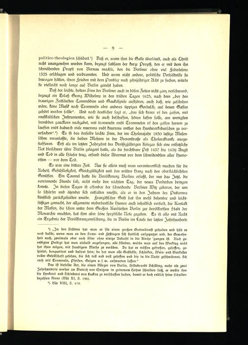 Es war eine bittere Zeit. Nur sie allein muß man verantwortlich machen für die Roheit, Gefühllosigkeit, Gleichgültigkeit und den wüsten Hang nach den oberflächlichsten Genüssen. Ein Taumel hatte die Bevölkerung Berlins erfaßt, der nur das Jetzt, die verrinnende Stunde sah, nicht mehr den nächsten Tag, der neues Verderben bringen konnte. In diesen Tagen ist offenbar der schneidende Berliner Witz geboren, der um so schärfer und ätzender sich entfalten mußte, als er in den Jahren des Pietismus künstlich zurückgehalten wurde. Französischer Geist hat ihn wohl behender und leichtfüßiger gemacht, der allgemeine niederdeutsche Humor auch inhaltlich vertieft, der Kontakt der Waffen, die schon unter dem Großen Kurfürsten Berlin zur bevölkertsten Stadt der Wonarchie machten, hat ihm aber seine spezifische Note gegeben. Es ist also mit Recht ein Ergebnis der Bevölkerungsmischung, die in Berlin im Laufe der letzten Jahrhunderte