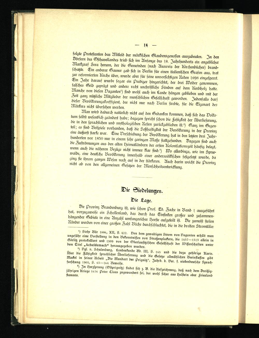 Man wird dadurch natürlich nicht auf den Gedanken kommen, daß sich das Volkstum selbst wesentlich geändert habe; dagegen spricht schon die Festigkeit der Überlieferung, die in den sprachlichen und mythologischen Resten zurückgeblieben ist?) Ganz im Gegenteil; es sind Beispiele vorhanden, daß die Seßhaftigkeit der Bevölkerung in der Provinz eine äußerst starke war. Eine Verschiebung der Bevölkerung hat in den letzten drei Jahrhunderten vor s850 nur in einem sehr geringen Maße stattgefunden. Dagegen sind auch die Zuströmungen aus den alten Heimatländern der ersten Kolonisationszeit häufig belegt, wenn auch die näheren Bezüge nicht immer klar sind?) Wo allerdings, wie im Spreewalde, eine deutsche Bevölkerung innerhalb einer andersvölkischen festgesetzt wurde, da ging sie ihrem ganzen Wesen nach, auf in der stärkeren. Auch darin weicht die Provinz »icbt ab von den allgemeinen Gesetzen der Menschheitsentwicklung,